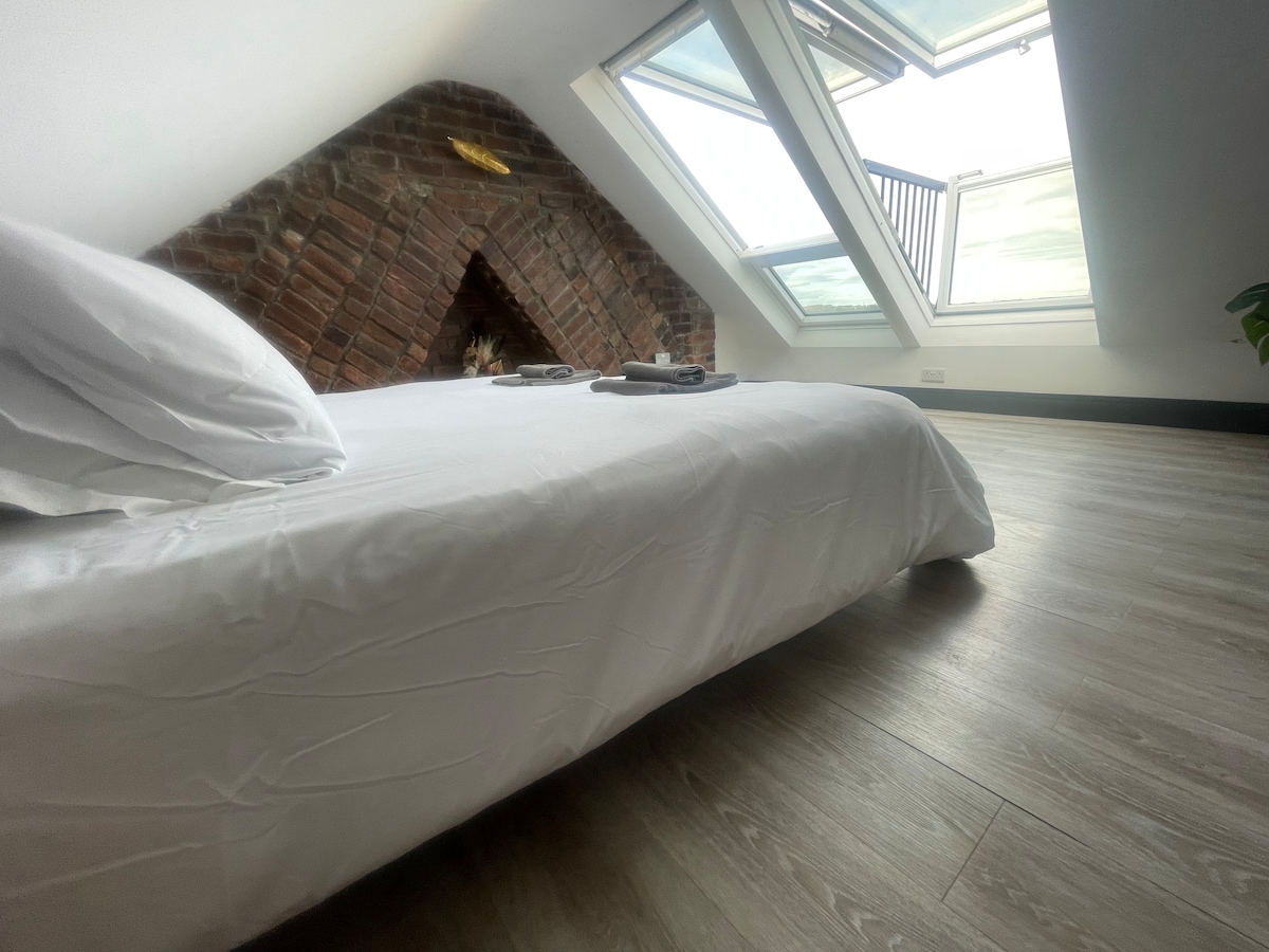 Mit Blick auf die rollende Brandung der Rest Bay in Porthcawl liegt The Loft at the Links, eine Dachgeschosswohnung mit einem Schlafzimmer in diesem atemberaubenden viktorianischen Gebäude der Klasse 11. The Links ist nur einen Steinwurf von • South Wales' Top-Surfen, Strand mit blauer Flagge • Wales Coastal Path • Wassersportzentrum – Surfen lernen/Fahrradverleih/Strandaktivitäten und Café-Bar • Royal Porthcawl Golf Club und andere in der Nähe Der Einkaufskomplex McArthur Glen, die atemberaubende Marktstadt Cowbridge und Cardiff sind innerhalb von 45 Autominuten erreichbar.