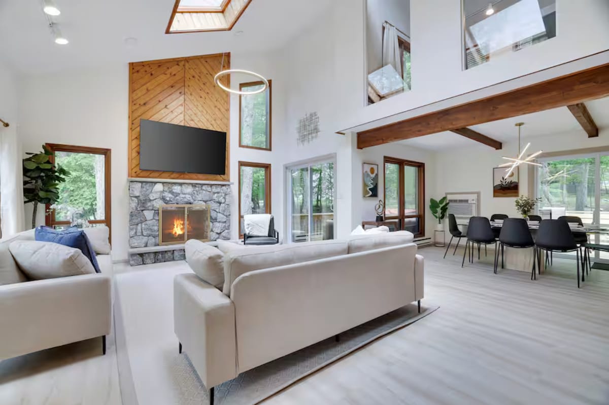 Günstig in den Poconos gelegen, nur 1 Stunde 30 Minuten von Manhattan und unter 2 Stunden von Philly entfernt! Unser entspannendes A-Rahmen-Chalet ist von europäischem Design/Architektur inspiriert und gibt dir das Gefühl eines nordischen Hauses in den Poconos. Genieße 4 große Terrassen, auf denen du die Vögel zwitschern hören und Kolibris, Schmetterlinge, Rehe und andere Wildtiere in einem „dschungelartigen“ Hinterhof beobachten kannst. Nur wenige Minuten von den beliebtesten Wanderzielen und Wasserfällen entfernt. Haustiere sind kostenlos willkommen (: