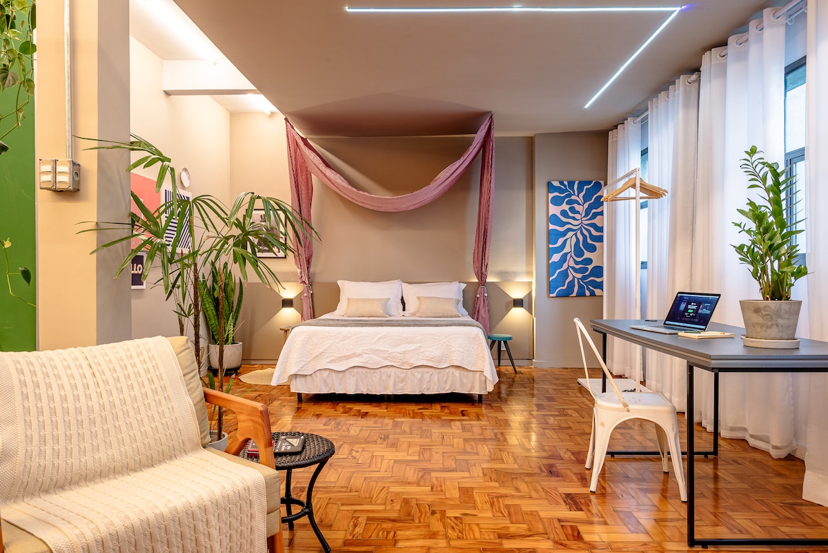 Genieße das böhmische und künstlerische Vila Madalena voller Bars, Restaurants und Cafés. Du kannst die Region kennenlernen oder sogar eine Tour zu den Stadtparks mit einem Fahrrad unternehmen, das kostenlos zur Verfügung steht. Wirst du zur Arbeit kommen? Konzentriere dich darauf am bequemen Tisch mit Blick auf den grünen Balkon mit einem schönen Blick auf die Baumkronen. Genieße schließlich den Fitnessraum, den Pool, die Sauna und den Snookerraum für deine vollständige Freizeit.