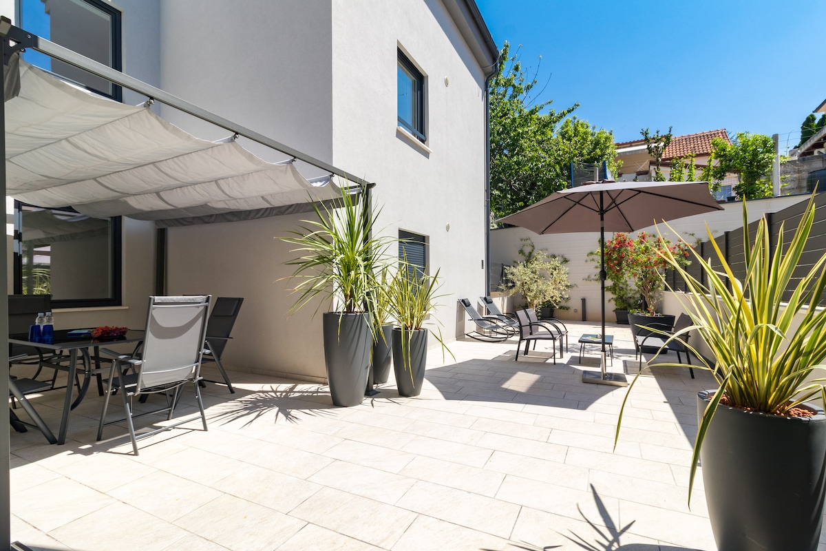 Dieses schöne und liebevoll dekorierte, nagelneue Gebäude (2024) verfügt über einen beheizten Pool, der den ganzen Tag über sonnig ist Villa Pollentia ist ein Gebäude mit 6 Wohnungen, in dem dein Gastgeber lebt und 2,0 km vom Zentrum von Pula entfernt ist. Das Gebäude ist modern eingerichtet, mit klimatisierten Wohn- und Schlafbereichen und eingebauter Fußbodenheizung. Es liegt am Dorfrand, mit einem schönen Blick auf die grünen Kiefern Das Apartment 103 befindet sich im Erdgeschoss und hat direkten Zugang zum Pool.