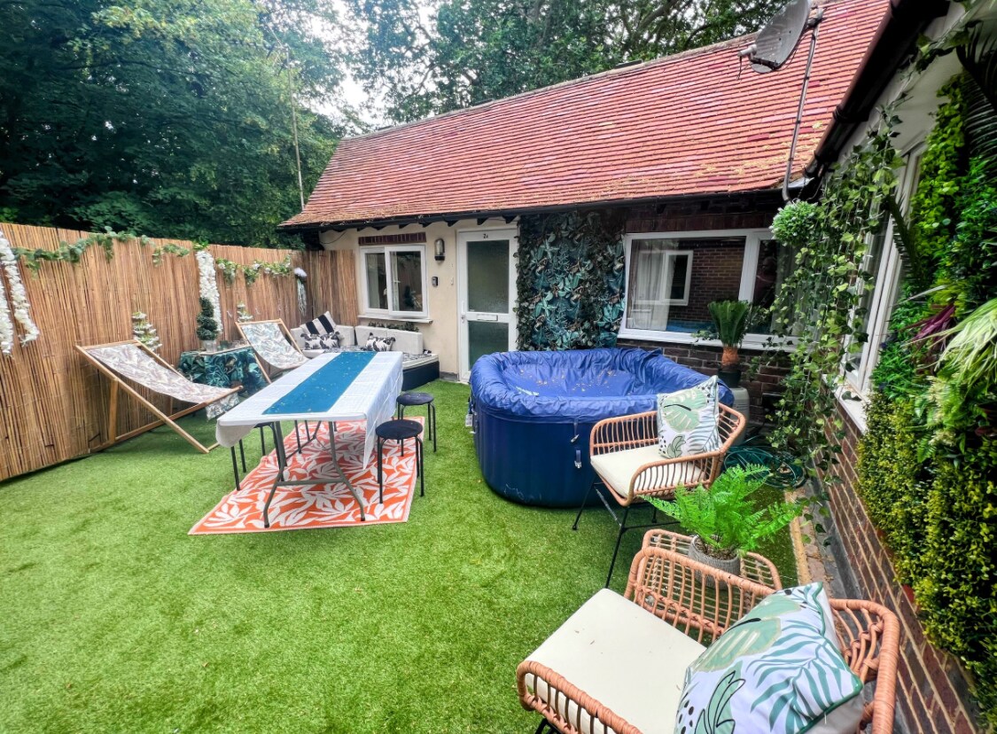Arrive to relaxing music and candle lit romantic studio space. Request the company of our hilarious pygmy goats or Pablo the pig in the enclosure located in your garden. Quirky, bohemian styled decor throughout. Private atmospheric decking areas and garden. So much to enjoy...hot tub, Pizza oven, BBQ, chimnea and the very popular boho bath house . Enjoy candle lit evenings in the giant tub ideal for couples to share or unwind in the hot tub. Ideal for couples but can sleep 4 plus travel cot.