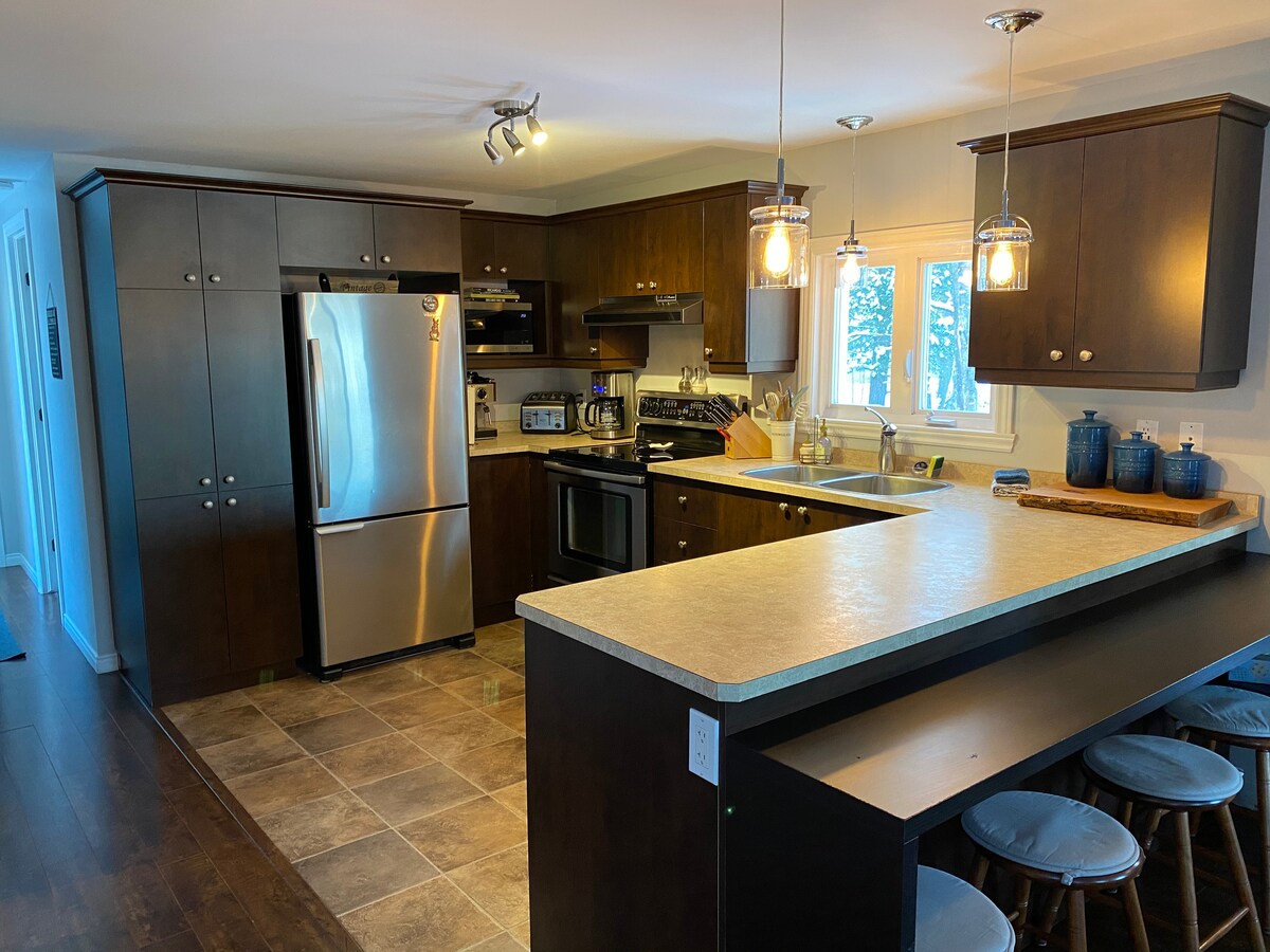 Entfliehe dem Alltag und genieße die Ruhe in diesem privaten Ferienhaus auf einem 1,2 Hektar großen Grundstück im Herzen der Eastern Townships. Genieße den Pool, das 7-Sitzer-Spa, die Sauna, die Feuerstelle, den Grill und den gemütlichen Innenkamin. Die geräumige Küche mit einer Insel und neuen Geräten sowie eine große Terrasse sind perfekt für Zusammenkünfte. Ideal für Remote-Arbeit mit schnellem WLAN, Klimaanlage und 3 komfortablen Schlafzimmern. In der Nähe von Owl's Head, Lake Memphremagog und Vermont. Perfekt für Paare, Familien oder Gruppen, die die Schönheit und den Komfort der Natur suchen!