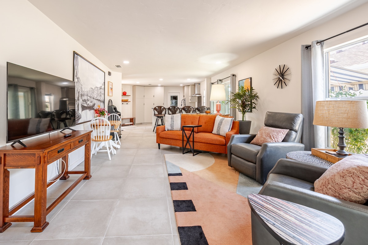 Begrüße dein stilvolles Villages-Erlebnis in dieser komplett renovierten, wunderschön eingerichteten Villa mit 2 Schlafzimmern und 2 Badezimmern im Dorf El Santiago. Gut ausgestattet mit privatem Garagenparkplatz, privatem riesigem Hof, Grill, privatem abgeschirmten Innenhof in Lanai, Waschmaschine/Trockner, WLAN und einem Golfwagen. Genieße die schöne 10-minütige Fahrt mit dem Golfwagen zum Lake Sumpter oder zu den Spanish Springs Town Squares.