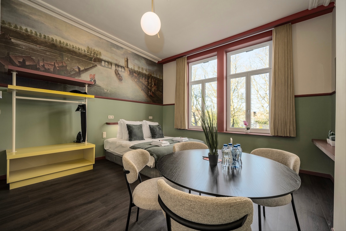 -SPACIOUS SUITE (1st floor) with a SPLENDID VIEW on the Canal from your private living ( 6 windows) ! Belfry and Market Place are at 3 min ! -Children from 12 year accepted on demand at reservation ! -No kitchen but : microwave,fridge,coffeemachine ,watercooker,cups ,glasses,spoons Coffeepads,tea,coffeemilk for 1st day -Tourism Tax Bruges 2025 :4 Eur/N/Adult to pay at arrival ! -Motorbikes , bikes : storage free : ask at reservation ! -Information provided for restaurants , museums , cafés .