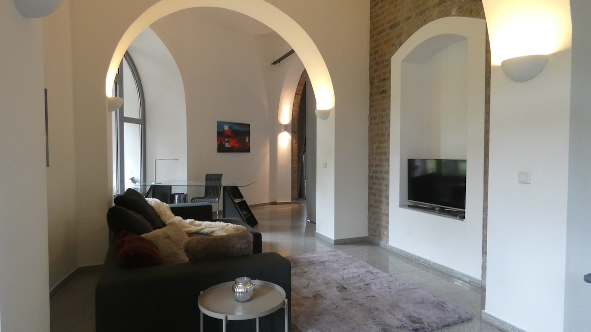 Modernes und gemütliches Altbauloft. Die Unterkunft wurde frisch saniert, großzügig ausgestattet und liebevoll eingerichtet. In dem neuen Boxspringbett (180*200) können bis zu 2 Personen schlafen. Zwei weitere Personen könne auf der Empore auf einer gemütlichen Matratze (180*200) schlafen. Die Empore ist über eine massive Leiter zugänglich. Die Wohnung verfügt über Minibar, Smart Tv mit Netflix und Amazon Prime Video, sehr schnelles Wifi, eine gut ausgestattete Küche mit Kaffeemaschine.