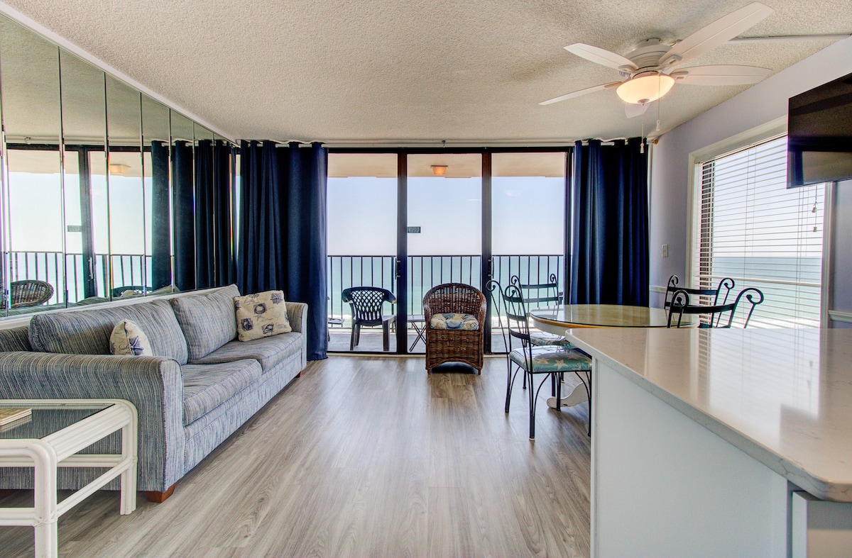 Oceanfront two bedroom condo located on the ninth floor, and has an ocean view. The pictures will show the owner's personal touches in making a comfortable and relaxing beach get away. There is a full kitchen and all necessary cookware and dishes. The condo can sleep four people. There is a queen Size bed in the bedroom number one and a TV. The master bedroom has a king size bed and a TV. The master bathroom has a walk in shower and the second bathroom has a tub/shower combo.