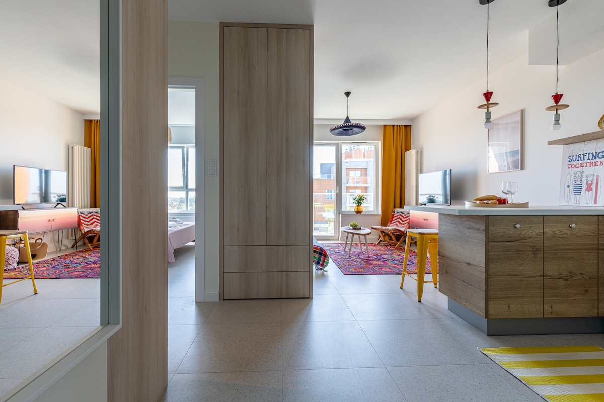Das Apartment 216 ist eine stilvolle und komfortable Wohnung mit einer Fläche von 47 m2, die sich in der zweiten Etage des Aparthotel Merwede Residence befindet. In der Wohnung haben die Gäste Zugang zu einem Wohnzimmer mit Schlafsofa, TV, voll ausgestatteter Küchenzeile, Esstisch, Schlafzimmer mit Doppelbett und Kleiderschrank. Das ergonomische Badezimmer verfügt über eine Dusche und eine Waschmaschine. Ein unzweifelhafter Vorteil der Wohnung ist ein möblierter Balkon, auf dem du die Sonne und die Meeresbrise genießen kannst.