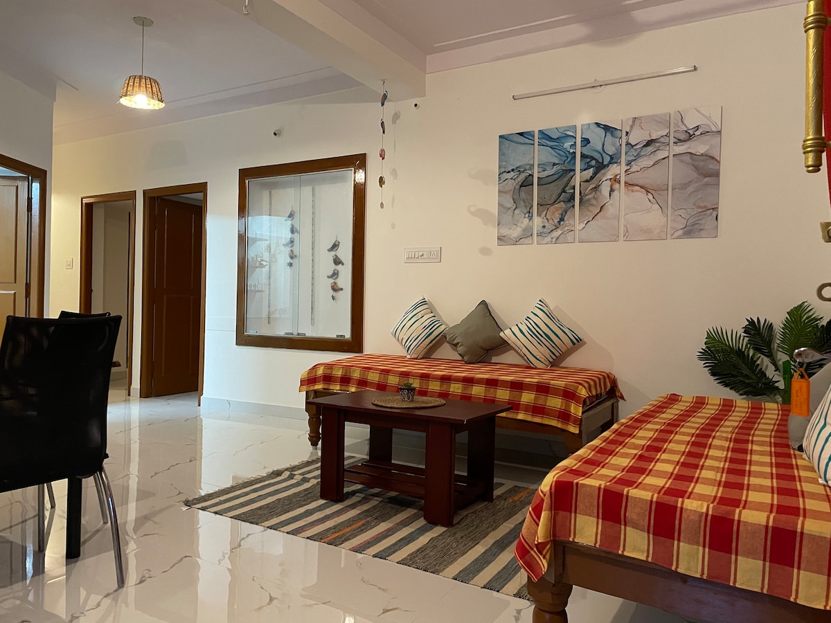 Erlebe Luxus & Komfort in unserer stilvollen 2-BHK-Wohnung in der Nähe von Manyata & Hebbal Willkommen in unserer durchdacht gestalteten luxuriösen 2BHK-Wohnung, in der Premium-Komfort auf moderne Ästhetik trifft. Egal, ob du geschäftlich, für einen Familienurlaub oder einen Langzeitaufenthalt in Bangalore bist, unser Zuhause ist so konzipiert, dass du dich in dem Moment, in dem du eintrittst, wohlfühlst. Wir sind stolz darauf, ein hotelähnliches Erlebnis mit der Wärme von zuhause zu bieten. Unsere Wohnung wird vor der Ankunft jedes Gastes gründlich gereinigt und desinfiziert.
