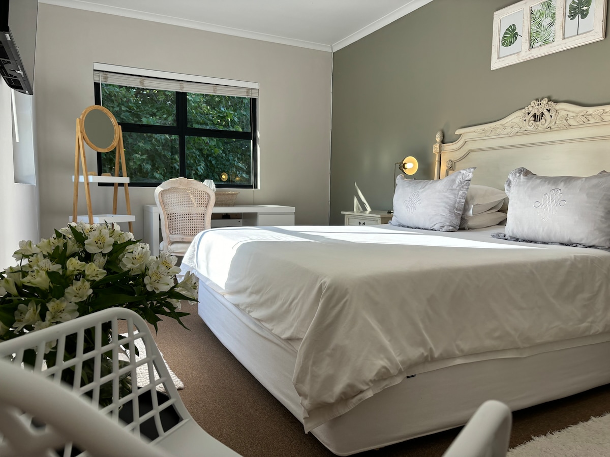 Genieße einen ruhigen Aufenthalt inmitten eines grünen Gürtels und Bergen. Zentral zu vielen Aktivitäten wie Wanderungen/Spaziergängen, Weingütern, lokalen Restaurants und Geschäften. Wir haben viele Haustiere auf dem Grundstück, 4 freundliche Hunde, nämlich 1 Rhodesian Ridgeback, 1 Labrador und 2 mittelgroße Mischlinge, 3 Katzen und 2 Hasen. Es ist sehr familienfreundlich, aber auch perfekt für einen erholsamen Kurzurlaub. Es gibt Parkplätze auf dem Grundstück. In Bezug auf die Sicherheit haben wir einen Wachmann auf unserer Straße.