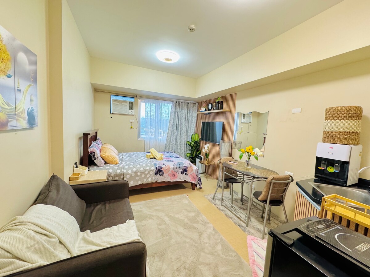 Genieße eine stilvolle und gemütliche Einzimmerwohnung in Uptown Cagayan de Oro - mit 50-Zoll-Fernseher mit Netflix und Youtube - renoviertes Badezimmer mit Badewanne, heißer und kalter Regendusche - voll klimatisierte Wohnung (1,5 PS Split-Klimaanlage im Wohnzimmer und 1 PS Fenster-Klimaanlage im Schlafzimmer) - mit funktionierenden Küchengeräten und Utensilien (4-Flammen-Elektroherd, Mikrowelle, Wasserkocher, Reiskocherpfannen) - mit Büchern, die du lesen kannst - Brettspiele, die du spielen kannst - Innenpool auf der gleichen Etage.