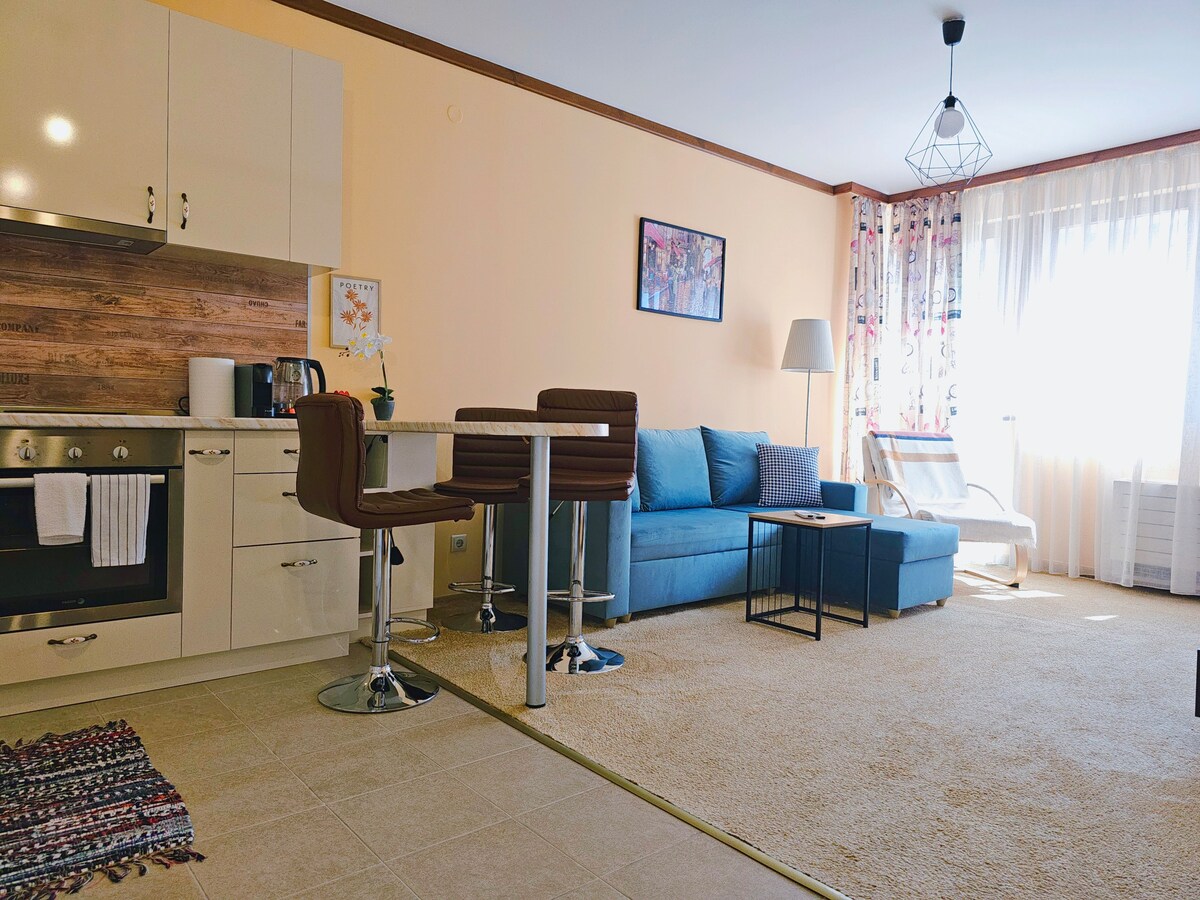 Enjoy a cozy 1-bedroom condo on the 3rd floor, set at one of the highest points in Bansko with stunning panoramic views of the city and direct proximity to Pirin National Park—where the air is crystal clear. The apartment features a fully equipped kitchen, a comfortable living room, a separate bedroom, and a bathroom with a relaxing bathtub. Designed with warmth and comfort in mind, it’s the perfect place to feel at home and unwind.