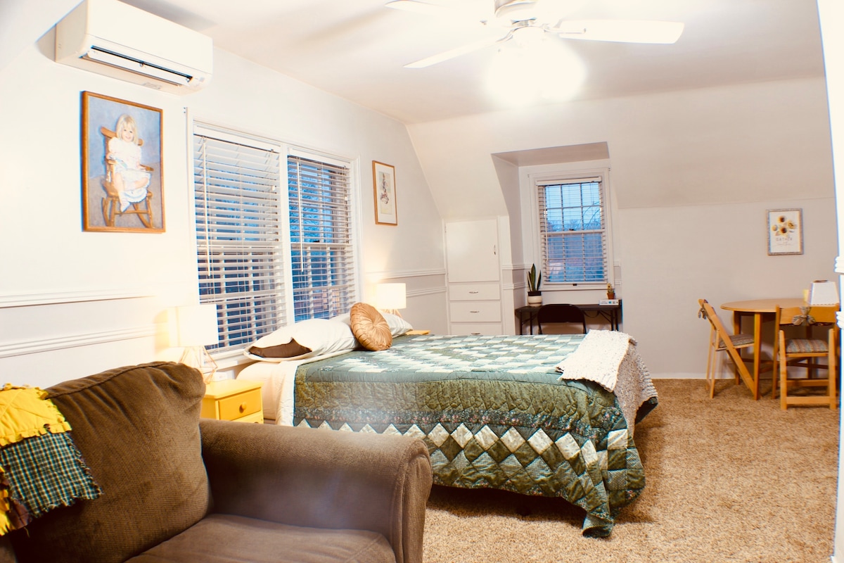 Dieser malerische und gemütliche Kurzurlaubsort bietet alles, was du brauchst, um dich wie zuhause zu fühlen. Das Hauptschlafzimmer verfügt über ein Queensize-Bett, einen Kleiderschrank und einen gemütlichen Schreibtisch. Die beiden kleineren Schlafzimmer verfügen jeweils über ein Einzelbett mit einem Kleiderschrank und teilen sich ein Jack-and-Jill-Halbbad. Das gemütliche Wohnzimmer ist der perfekte Ort, um sich mit DirecTV und WLAN zu entspannen. Die Couch bietet bei Bedarf ein ausziehbares Bett. Die Küche ist mit allen Geräten sowie einer Keurig für alle deine warmen Komfortgetränke ausgestattet.