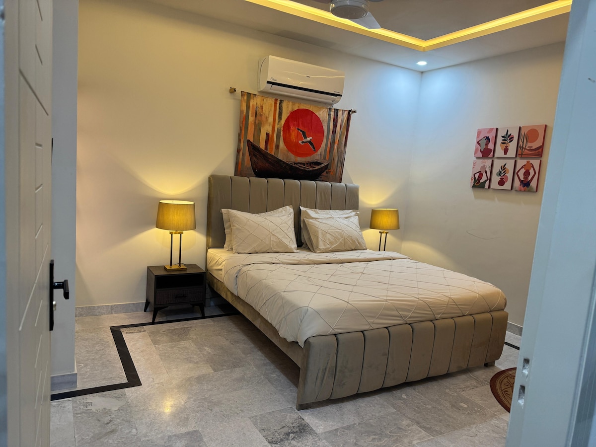 Erlebe den Charme unserer gemütlichen Wohnung in Gulberg Greens, ideal für Familien und junge Paare. Mit einem gemütlichen Schlafzimmer, einer gut ausgestatteten Küche und einem einladenden Wohnbereich sowie einer lebendigen Terrasse mit stimmungsvoller Beleuchtung und warmem Ambiente wirst du dich wie zuhause fühlen. Die Wohnung liegt im Herzen der Zwillingsstädte, nur wenige Minuten von Top-Attraktionen wie der Centaurus Mall und der Giga Mall entfernt. Ideal für Geschäfts- und Urlaubsaufenthalte, buche jetzt für ein heimeliges Erlebnis in Islamabad!
