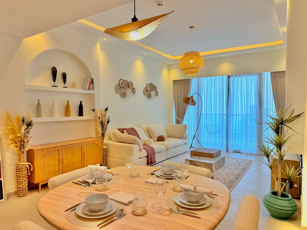 Erlebe Luxus auf der 33. Etage im 5-Sterne Paramount Midtown Hotel and Residence, Dubai in der Nähe von Downtown und Metro. Dieses stilvolle 125 m ² große Apartment mit 2 Schlafzimmern und 2,5 Badezimmern bietet einen atemberaubenden Blick auf den Burj Khalifa und das Meer. Genieße erstklassige Annehmlichkeiten, eine voll ausgestattete Küche und ein gemütliches Wohnzimmer. Das Hotel liegt in Business Bay, nur wenige Minuten von der Dubai Mall und den Top-Attraktionen entfernt. Platz für 8 Personen (6 Erwachsene + 2 kleine Kinder). Auf Anfrage gibt es Highspeed-WLAN, Fernseher, private Parkplätze und Babyutensilien.