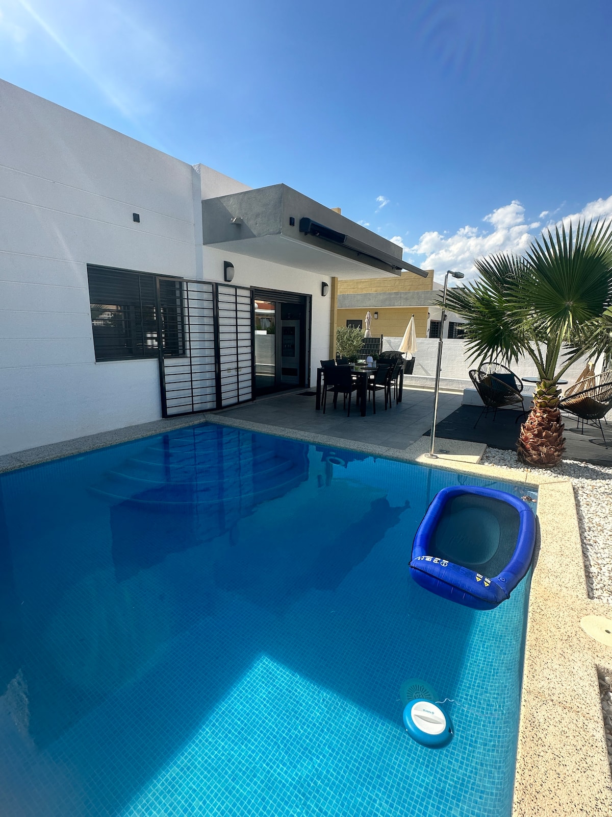 Disfruta de unas vacaciones únicas en esta villa en Busot con piscina privada, jardín y barbacoa. Con 3 dormitorios, 3 baños, amplio salón y cocina equipada, es ideal para familias o amigos. Relájate al sol, descubre las playas de El Campello y San Juan a solo 10 minutos. Cerca de las famosas Cuevas del Canelobre y a 25 min de Alicante. Supermercado, bares y centre deportivo a tan solo 2 minutos. Se recomienda disponer de coche para visitar playas, pueblos cercanos y rutas de montaña.