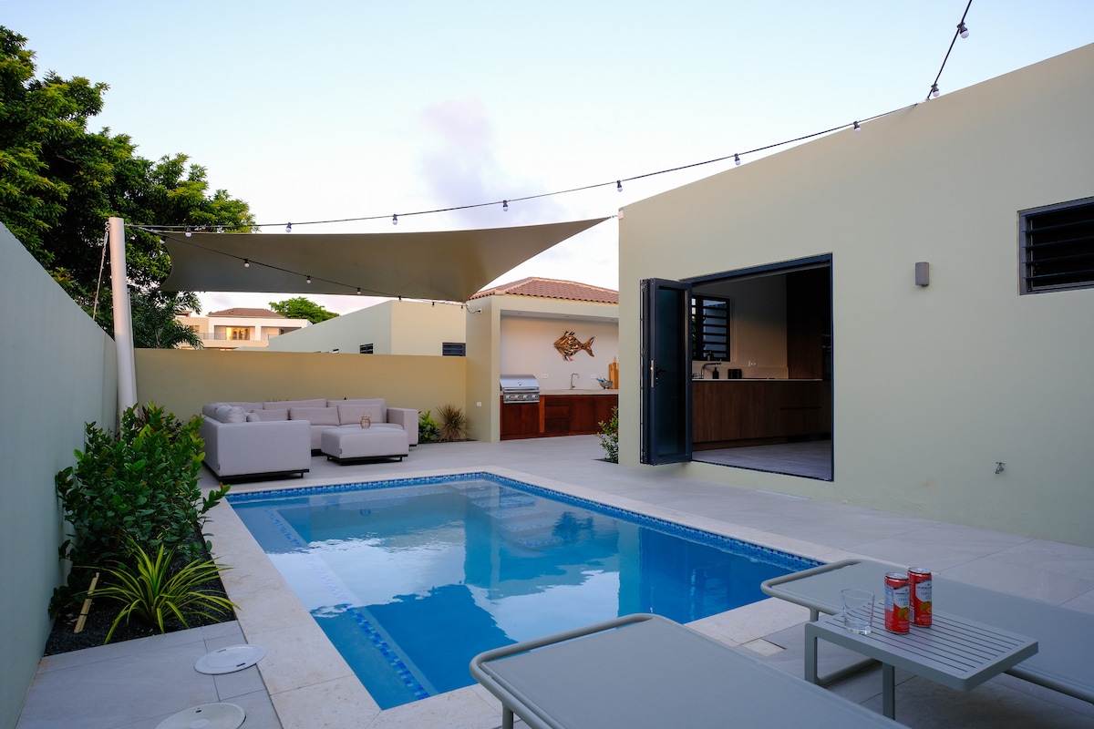 Experience the ultimate getaway in this modern, full air condition & equipped, newly built home! Nestled in a gated community with 24/7 security, it features a cozy private pool area and unbeatable location across from the iconic Mambo Beach area. Just a 5-minutes' walk to pristine beaches, vibrant restaurants, nightlife, Dolphin Academy, shops, gym, diving schools, ATVs/car rental, padel/tennis courts, casino, playgrounds and more close by. Plus, you're just a 5-minutes drive to the city center