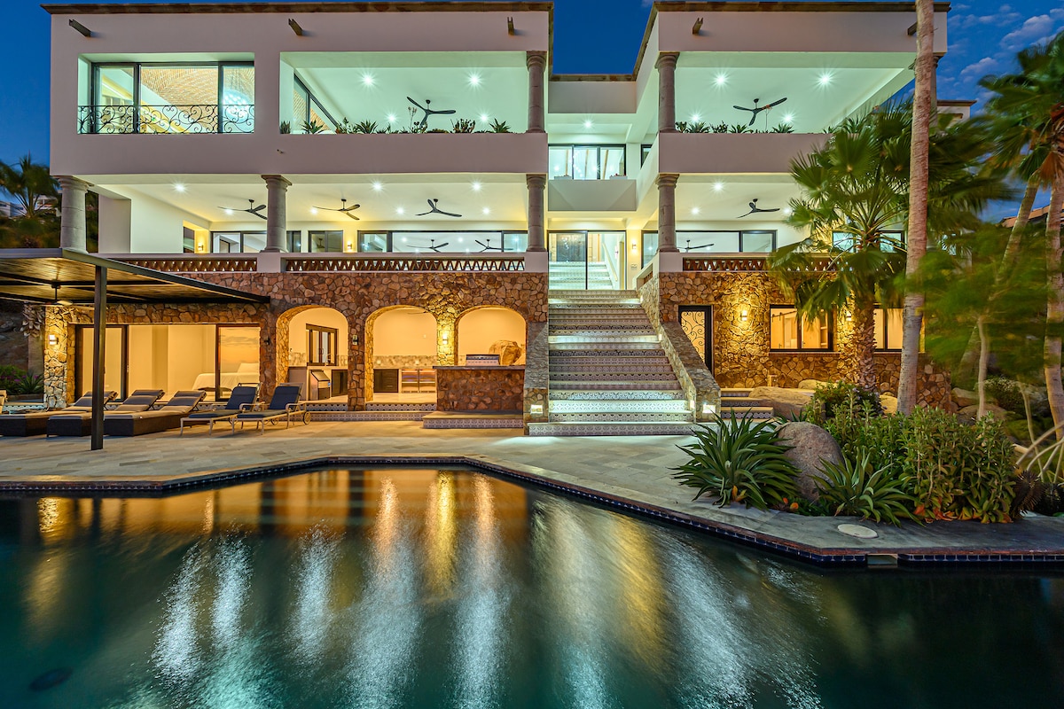 VIP Sunset Villa, hosted by Cabo Connections, offers a true all-inclusive experience with a private chef, bartender, maid, and concierge. This authentic Mexican-style villa features a truly one-of-a-kind panoramic view and is widely known for having the best sunset view in all of Cabo. Enjoy seamless indoor-outdoor living, expansive terraces, and a heated pool perfectly positioned to take in unforgettable Cabo sunsets every evening.