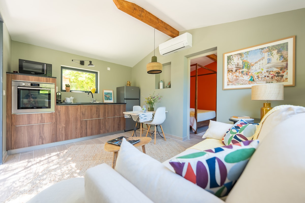 Unabhängiges Studio von 25 qm, von Les Gîtes de France mit 3 Sternen ausgezeichnet. Angrenzend an die Hauptvilla, genießen Sie den Garten und den privaten Whirlpool (auf vorherige Reservierung mit einem Zuschlag von 5 € pro Nacht vor Ort zu zahlen). Komplett neu ausgestattet, verfügt es über ein ausklappbares Doppelbett, das tagsüber Platz für ein Sofa lässt, um einen großen Raum zu genießen. Ausgestattete Küche, reversible Klimaanlage, Bad mit WC und ebenerdiger Dusche, Glasfaser-WLAN, Fernseher.