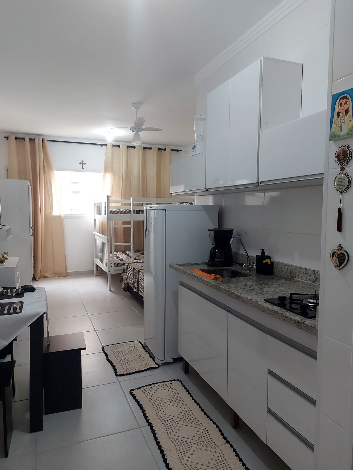 Machen Sie es sich in unserem ruhigen und gemütlichen Raum im Condomínio da Fé in Cachoeira Paulista / SP gemütlich. Das Studio befindet sich im 14. Stock mit 24-Stunden-Rezeption und ist nur 5 Gehminuten von Canção Nova entfernt, ideal für diejenigen, die an Veranstaltungen mit absoluter Bequemlichkeit teilnehmen möchten. Zusätzlich zu der Nähe von Restaurants, der berühmten Messe für religiöse Gegenstände, Märkten und Apotheken. Das Studio verfügt über zwei Räume mit Einbaumöbeln und Haushaltsgeräten, die Komfort und Funktionalität für Ihren Aufenthalt bieten.