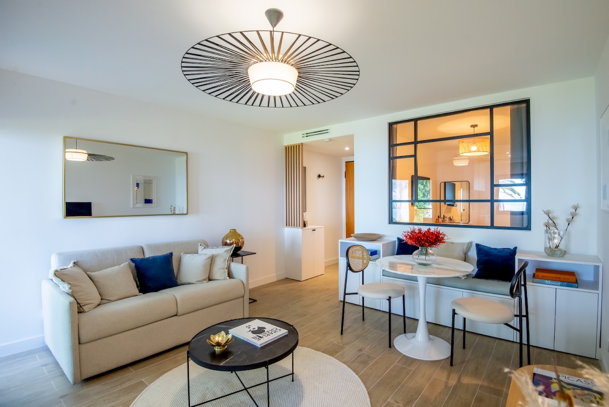 Diese Cocooning-Wohnung am Meer, ideal für Paare, bietet einen beruhigenden Meerblick. Die Wohnung ist 8 Minuten mit dem Auto vom Flughafen und 10 Minuten zu Fuß von der Pferderennbahn von Cagnes-sur Mer und lokalen Geschäften entfernt. Es verbindet Komfort und Ruhe. Das helle Wohnzimmer verfügt über ein hochwertiges Schlafsofa und einen Flachbildfernseher. Die Einbauküche ist mit einem Geschirrspüler und einer Nespresso-Kaffeemaschine ausgestattet. Keine Reinigungskosten.