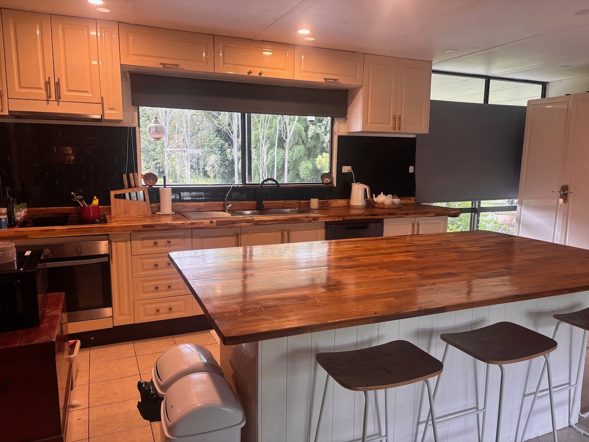 15 mins drive from town. Gorgeous Rainforest Haven! Private Entrance,Self Contained,Kitchen,lge bedroom+ensuite,courtyard, table chairs, Aircon. Sink Microwave cutlery crockery cooking utensils,tea coffee milk, toaster, portable cooktop, Air-fryer, BBQ. TV+Netflix. Attached to thick front wall of house that also has an unused locked door as part of wall . Still Very private. Lil & Rob live here +Ziggi our small non-malting clean humanoid pooch! Share laundry pool yard. Tapwater great4drinking