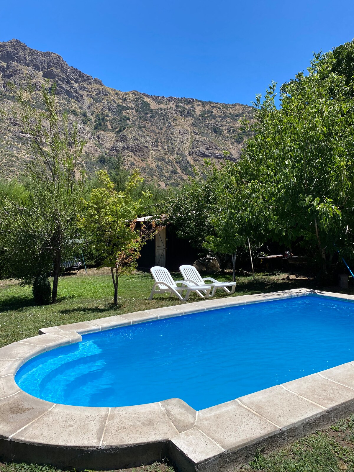Cabaña y piscina uso exclusivo, tranquilo poblado El Ingenio, a 18km Plaza San José de Maipo. Casa 65 m2, terreno 500 m2. Caben 6 personas, 2 dormitorios, 2 baños, 1 cama matrimonial, 1 cama nido y 1 camarote. Hay sabanas y toallas, cocina equipada, bosca leña, piscina de 3,5x5mt x 1.30 mt . Sitio cercado, se aceptan 2 MASCOTAS. PROHIBIDO MUSICA JARDIN. Mín. 2 noches. Llega bus, colectivo, auto, bicicleta, camino pavimentado. Hay Wifi, Almacenes. Vista cordillera.