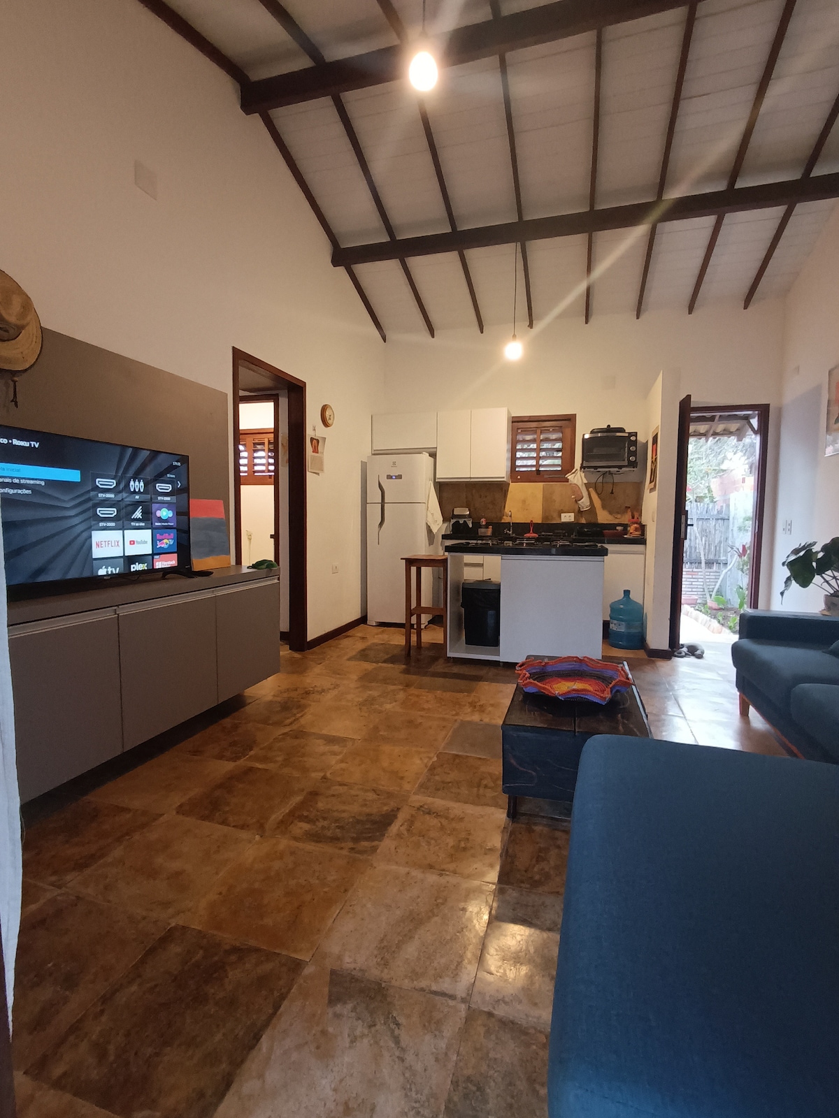 Uma casa com um ar de rusticidade e conexão com a natureza pra deixar tudo mais agradável. A casa conta com espaços amplos, 3 andares e uma área de convivência adorável. Ar condicionado ,frigobar e tv na suíte principal, na outra temos climatizador e camas de solteiro. Cozinha com fogão, geladeira, microondas. Temos um mirante com uma vista incrível para ser apreciada de uma redinha. Estamos bem localizados a poucos metros da praia ,tudo pode ser feito a pé. Não temos estacionamento.