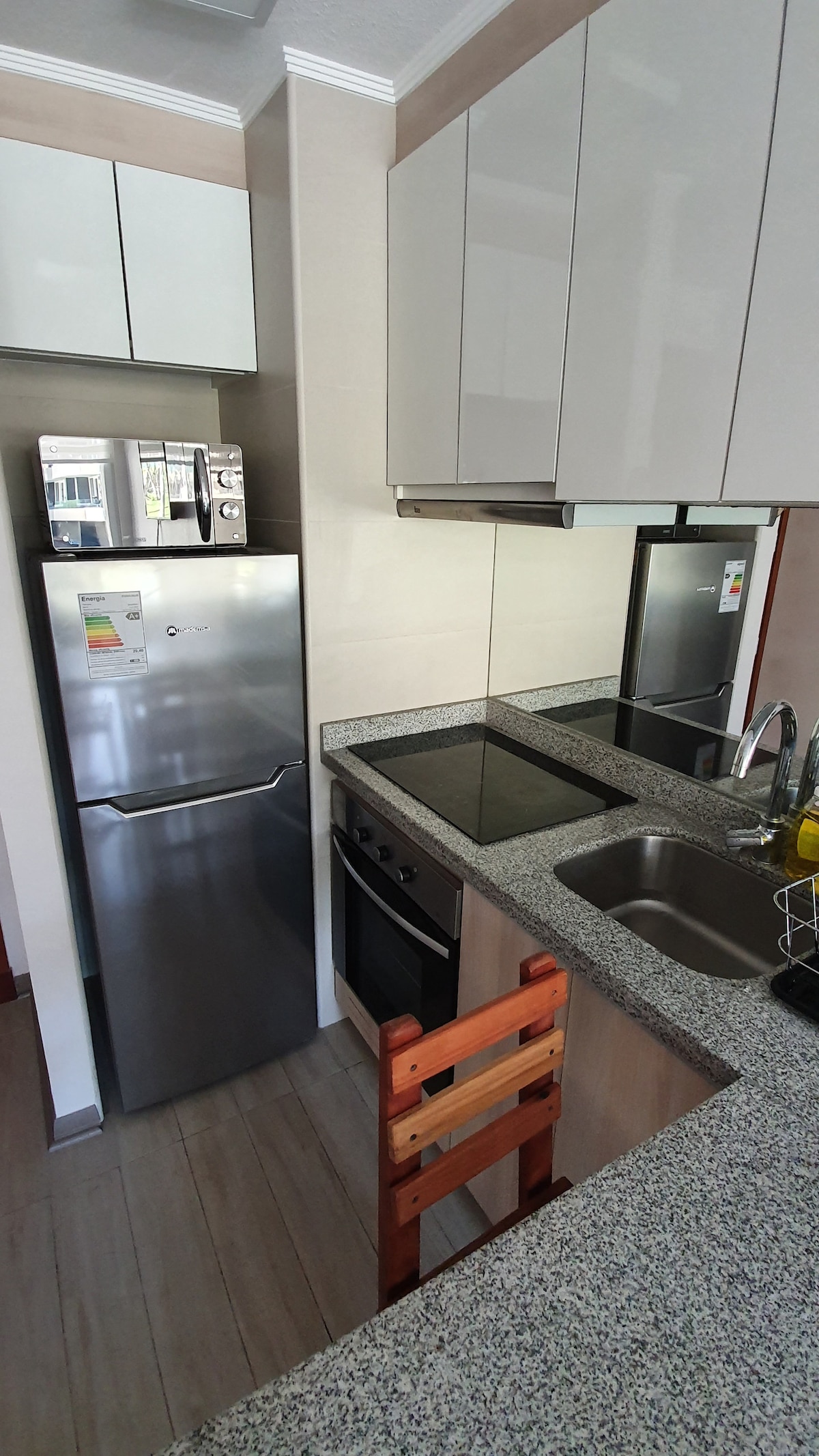 Nuevo y acogedor estudio en la mejor ubicación de Pucón, a pasos de playa grande, centro, y aislado del ruido de la calle principal. Cuenta con cama de 2 plazas, un futón de 2 plazas, cocina full equipada, baño completo, WiFi, TV 49" con Netflix, Disney+ y más, terraza, calefacción, parrilla, cafeteras, 2 bicicletas de uso ilimitado, entre otros. Estacionamiento público frente al acceso al edificio disponible. Incluye ropa de cama, toallas, e insumos básicos de baño y cocina para cada estadía.