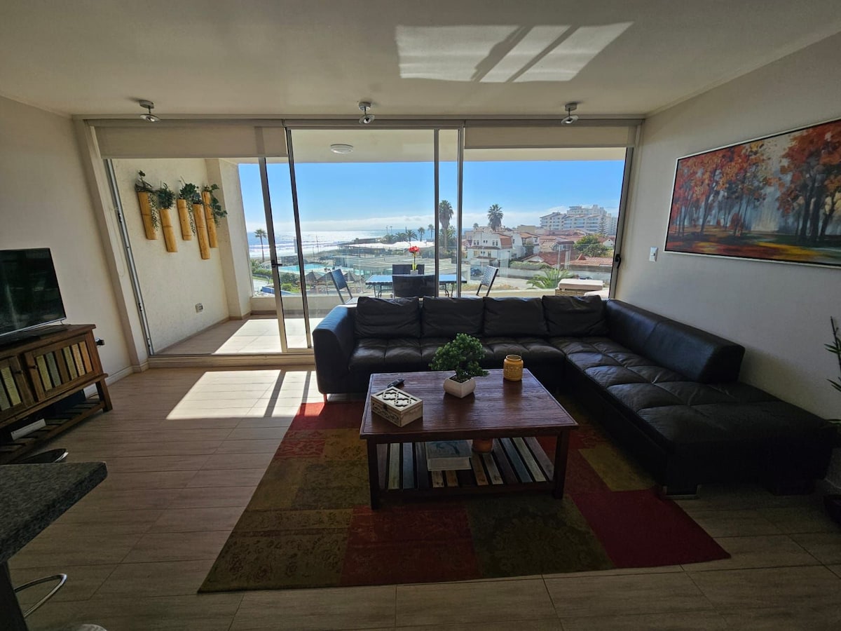 Depto. frente al mar .2 habitaciones, 2 baños. Lavandería, conserje las 24 hrs, un estacionamiento techado gratuito,juegos para niños. Cercano a centros comerciales y restaurantes.Posee wifi, cable, cocina full equipada.Salida directo a la playa. Piscina Distancias: Aeropuerto 13km. Terminal de buses Coquimbo 3,2km. Enjoy 1,9 km. 4 Esquinas 5,4km Skate Park Coquimbo 140 metros. Mall Vivo Coquimbo 3 km. Hospital San Pablo 3,9 km Faro La Serena 6,9