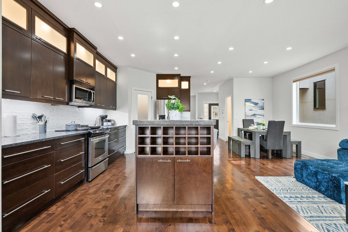 Welcome to a rare Calgary stay that blends the space of a multi-story townhouse with the flexibility of a private suite two units seamlessly combined into one stylish retreat. With 4 bedrooms, 3.5 bathrooms, and thoughtfully styled interiors in calming whites, greys, and teals, this home is perfect for families, groups, or long-stay travelers who value privacy, flow, and comfort. Located in a vibrant urban community, you'll enjoy clean design, luxury touches, and smart separation of space inclu