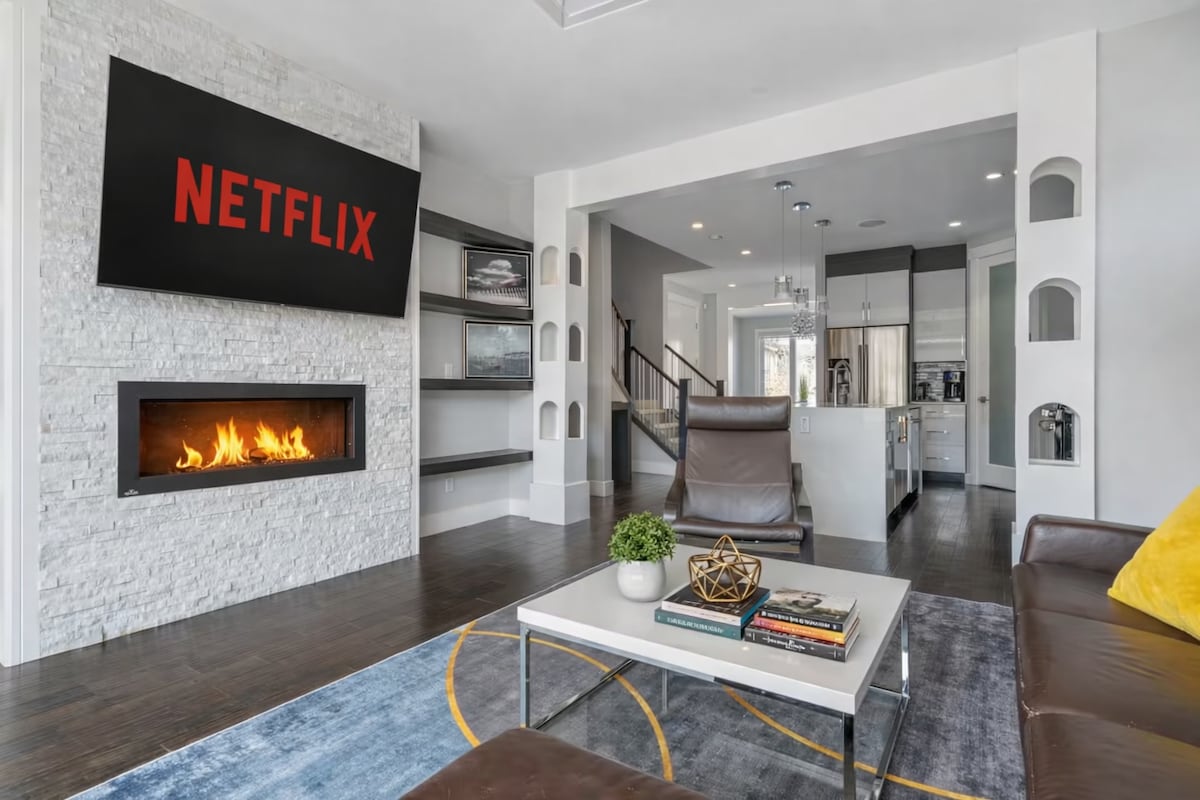 Experience upscale comfort with two elegant master suites featuring king beds, private baths, walk-in closets, grand windows, double vanities, a steam shower (this is the Sauna in the amenities), and heated tile floors. The main level boasts a marble fireplace, gourmet kitchen with a 10ft island, dining area, and powder room. Enjoy a 6–7 person hot tub and nearby golf-course walking trails. Inner-city location—7 mins to downtown, 13 mins to the airport, with easy, affordable Uber access.