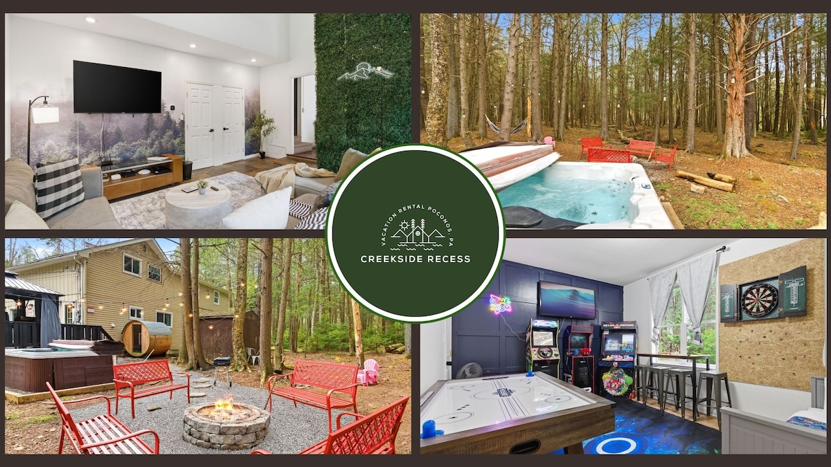 Entfliehe einer ruhigen Pocono-Oase mit gemütlichen Wohnbereichen, einer Gourmetküche und einem unterhaltsamen Unterhaltungsraum. Dieses Blakeslee-Juwel bietet luxuriöse Kingsize-Betten, zwei Etagenbetten und eine Schlafcouch. Tritt in die Natur ein, um Whirlpool, Lagerfeuer am See und Kajak zu entspannen, alles vor der Kulisse der majestätischen Kiefern. Abenteuer im Skigebiet Jack Frost oder genieße die natürliche Schönheit des Hickory Run State Park. Perfekt für alle Jahreszeiten, ist es ein idyllischer Ort für Familienfreude und aufregende Eskapaden.