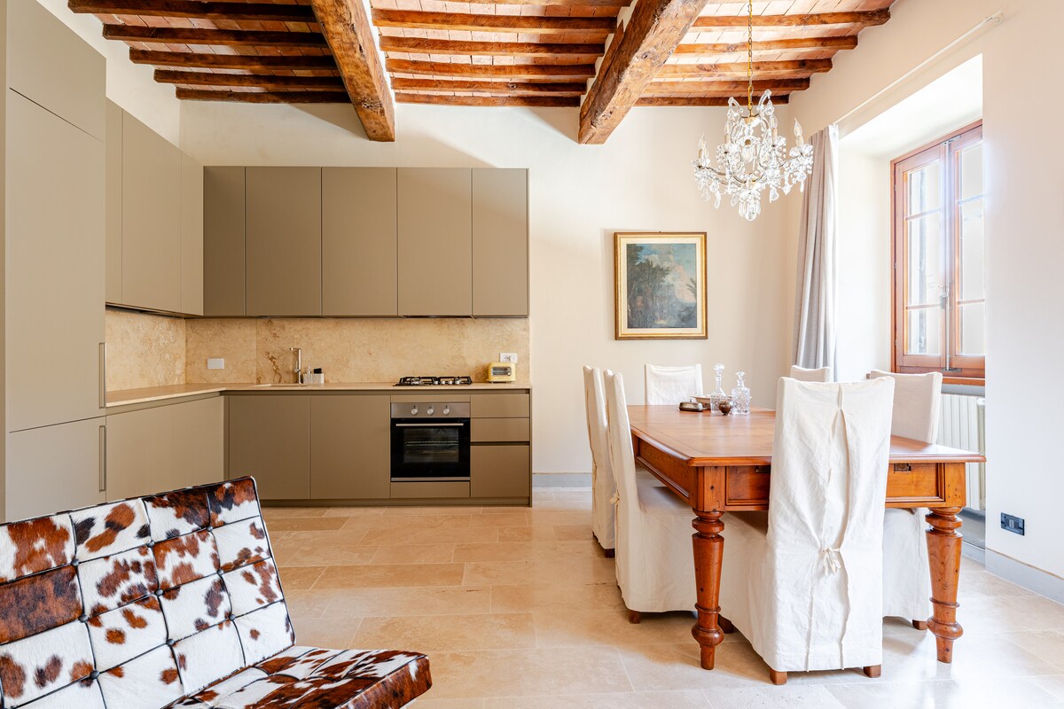 Das helle und luxuriöse Loft-Apartment “Il Frantoio” (160 qm) befindet sich im Ortszentrum des mitteralterlichen Dorfes Radicondoli. Der große Open-Space Bereich weist auf die antike Funktion dieses Gebäude hin, das früher die Olivenölmühle der Gemeinde war. Die originale Steinmühle wurde in den Renovierungsarbeiten wiederverwendet und bildet heute in abgewandelter Form einen Teil der außergewöhnlichen Inneneinrichtung.