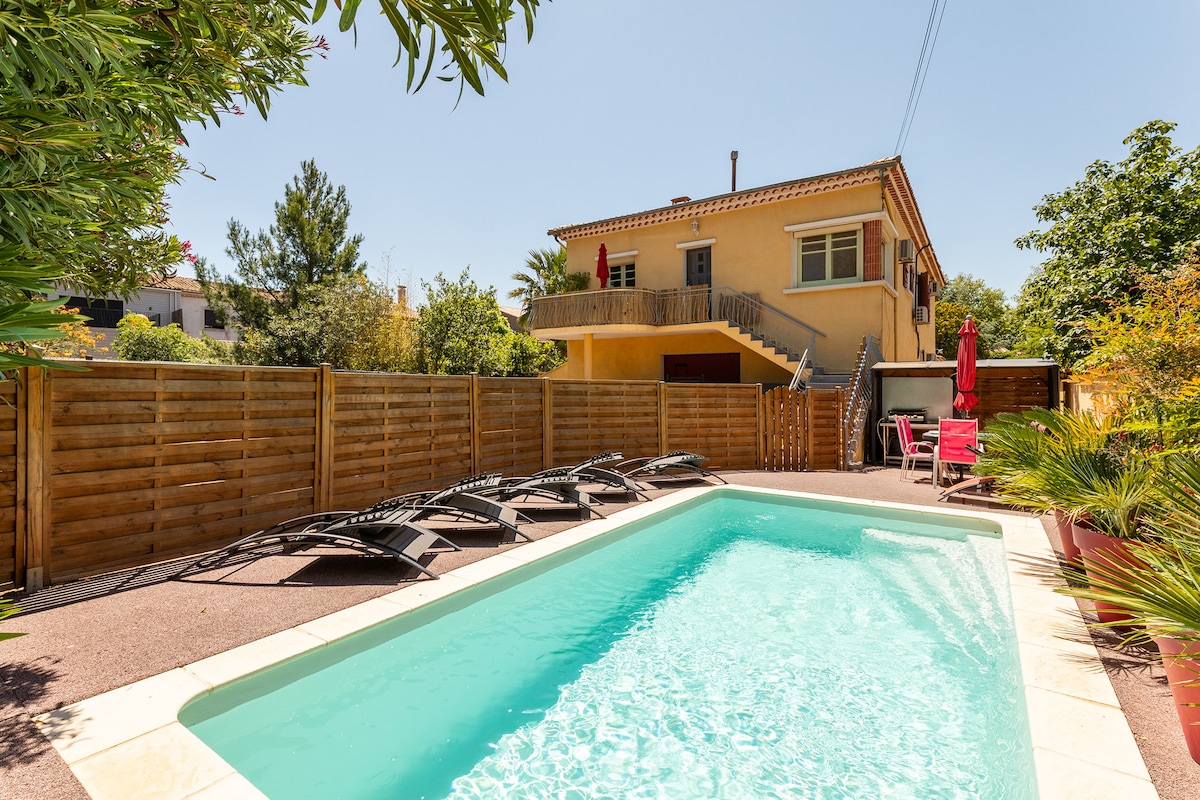 🌞🏖️ Au Nid d’Hirondelles – Marseillan Maison de 110 m², entièrement climatisée, située dans un quartier calme, idéale pour 6 personnes, pour des vacances en famille ou entre amis, à seulement 2 minutes à pied du centre-ville, du port et d’un centre commercial. Piscine privée chauffée à 28 °C, ensoleillée toute la journée, terrasse avec coin repas et cuisine d’été, cour de 150 m², parking sécurisé (2 places).