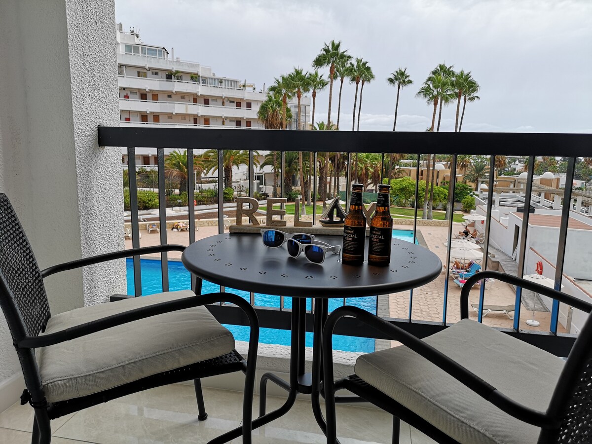 Willkommen in unser renovierten Wohnung mit beeindruckendem Meeresblick, in der Nähe von wunderschönen Stränden und Surfspot. Ausgestattet mit schnellem WLAN, Smart-TV, voll ausgestatteter Küche, wunderbarer Dusche, Waschmaschine und allem Komfort. Gäste haben freien Zugang zum Schwimmbad. Die Bus und Taxis befindet sich direkt vor die Wohnung. Es gibt Supermärkte und Geschäfte vor die Wohnung. Nur 15 km vom Flughafen, 5 Gehminuten von Playa de lad Americas und 8 min von Playa de Troya entfernt.