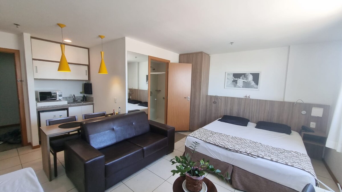 Curta uma experiência elegante neste lugar bem-localizado. Bem próximo de supermercados, padarias, restaurantes e todo tipo de comércio. Melhor localização da cidade com todo o conforto do serviço de um flat. Café da manhã não incluso, mas oferecido pelo restaurante do hotel, bem como almoço e jantar. Academia e sauna no predio. Estacionamento na rua.
