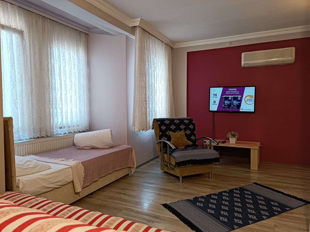 Unsere Wohnung befindet sich im Stadtzentrum, zwischen den Märkten, Restaurants, Geschäften, dem Çanakkale Pier, 50 Meter von Aynalı Carşı, 200 Meter vom Schloss Cimenlik und 300 Meter vom Troy-Pferd entfernt. Kostenpflichtige Parkplätze stehen auf der ersten linken 30 Meter hinter unserem Gebäude zur Verfügung. Es ist nicht erlaubt, in unseren Zimmern zu rauchen, du kannst unser Café, das sich auf der Terrasse befindet, 24 Stunden lang zum Rauchen nutzen. Tee, Kaffee, gemischtes Frühstück, Toast, Pfannkuchen sind zwischen 08:00 und 14:00 Uhr in unserem Café auf dem Terrassenboden