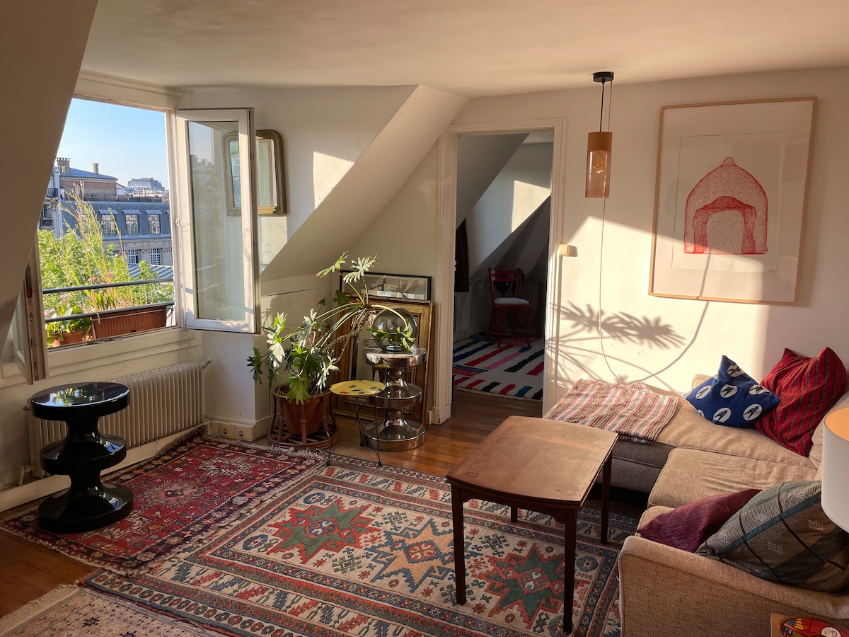 Herzlich willkommen bei mir! Es ist meine Hauptwohnung, es gibt also alle meine persönlichen Sachen und allen notwendigen Komfort für Ihren Aufenthalt. Ein renoviertes Studio von 30 m², auf der Hofseite, daher sehr ruhig, hell, mit Balkon und einem magischen Blick über die Dächer von Paris. Dekor im Stil der 70er Jahre, Doppelbett, Einbauküche, WLAN, Waschmaschine und Geschirrspüler. Das Hotel liegt am Canal St-Martin, nur einen Katzensprung von der Métro République entfernt, seine zentrale Lage ist ideal und die Umgebung sehr lebendig.