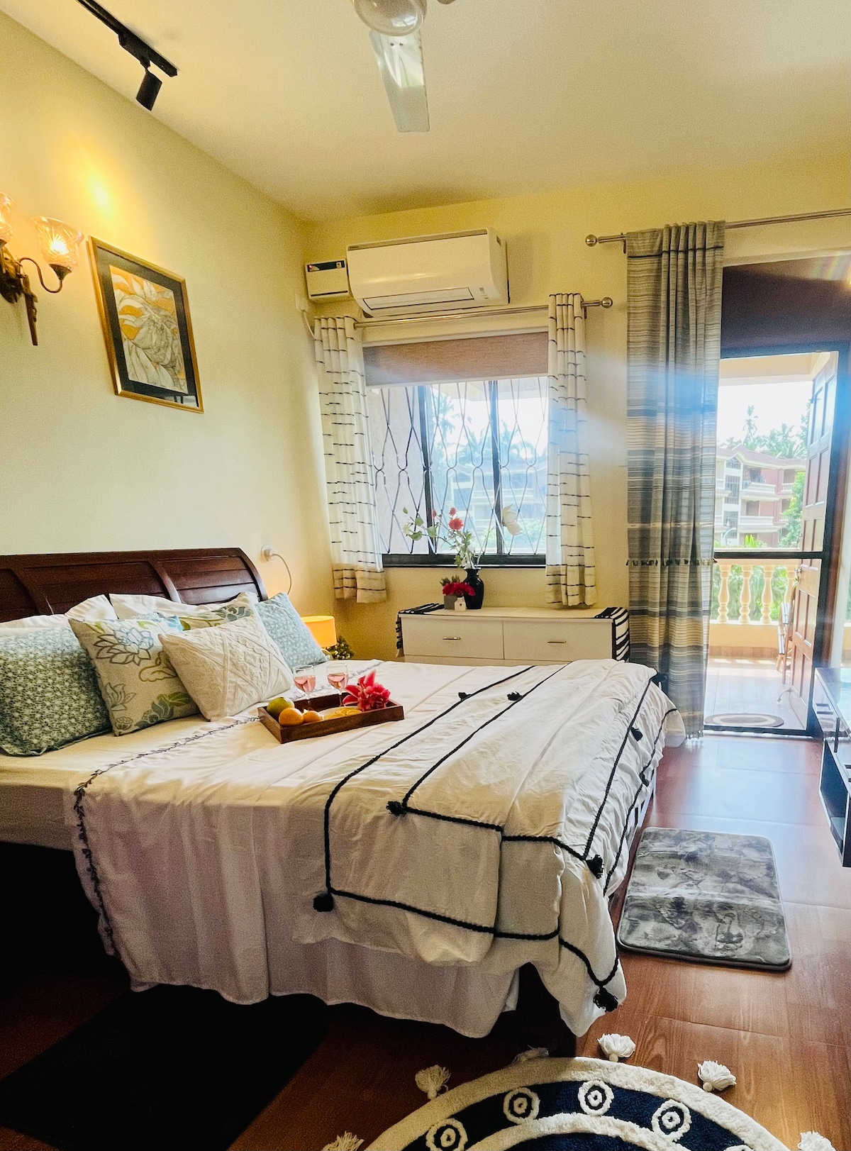 Unsere Studio-Wohnung liegt im ruhigen Paradies von Candolim und bietet die perfekte Mischung aus Komfort und Bequemlichkeit für eine Familie. Dieser charmante Rückzugsort an der Küste ist nur einen Steinwurf vom unberührten Strand entfernt und sorgt dafür, dass das beruhigende Rauschen der Wellen nie weit von deinen Ohren entfernt ist. Wenn du dieses gemütliche Studio betrittst, wirst du von einem geschmackvoll eingerichteten Wohnbereich begrüßt, der von natürlichem Licht durchflutet wird und eine warme und einladende Atmosphäre schafft.