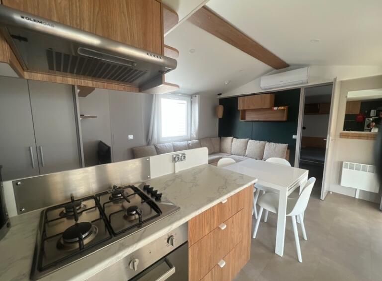 MOBILHEIM 6 Plätze 40 m² mit reversibler Klimaanlage, große eingezäunte Außenterrasse mit 1 sicherem Tor, Gartenmöbel, 2 Liegestühle. Großes Wohnzimmer mit verstellbarem TV, 1 Schlafsofa für 2 Personen, 2 große Schlafzimmer, davon 1 Elternschlafzimmer, hochwertige Betten mit großem Ankleideraum und TV Ausgestattete Küche, Geschirr, Backofen, Mikrowelle, Herd, Kühlschrank mit Gefrierfach, Toaster, Wasserkocher, Filterkaffeemaschine und TASSIMO-Pads, Geschirrspüler, Waschmaschine und Wäscheständer.