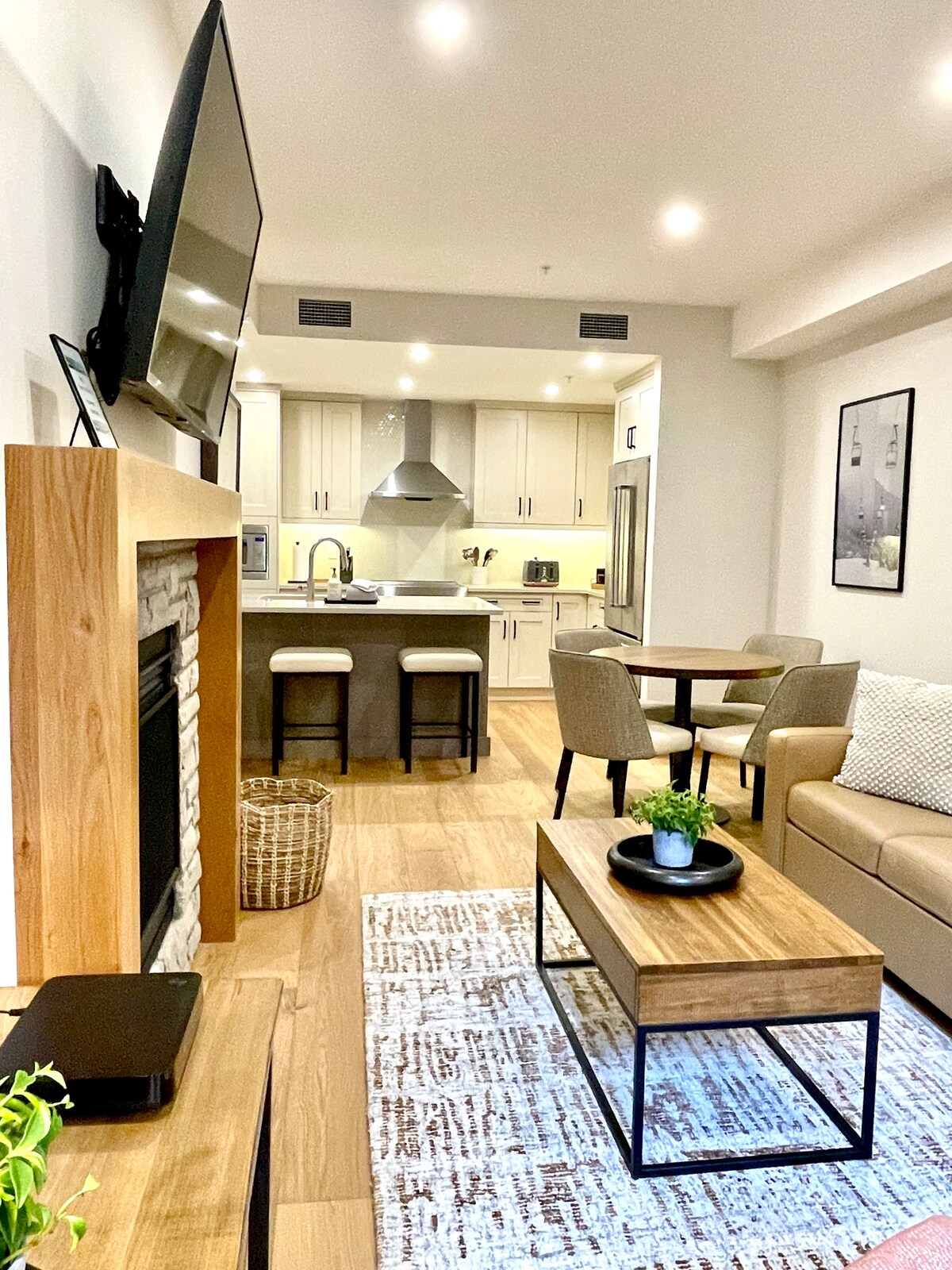 Welcome to your peaceful and stylish Canmore getaway! This luxurious condo is just a 10-minute walk from the town centre, putting shops, restaurants, and trails right at your doorstep. Relax by the cozy stone fireplace, sink into a plush king-sized bed, or host extra guests on the high-quality sofa bed. Enjoy bright, airy living space, fully equipped kitchen, in-suite laundry, complimentary parking, and 1 GB high-speed Wi-Fi. Ideal for adventure or relaxation in the Rockies.