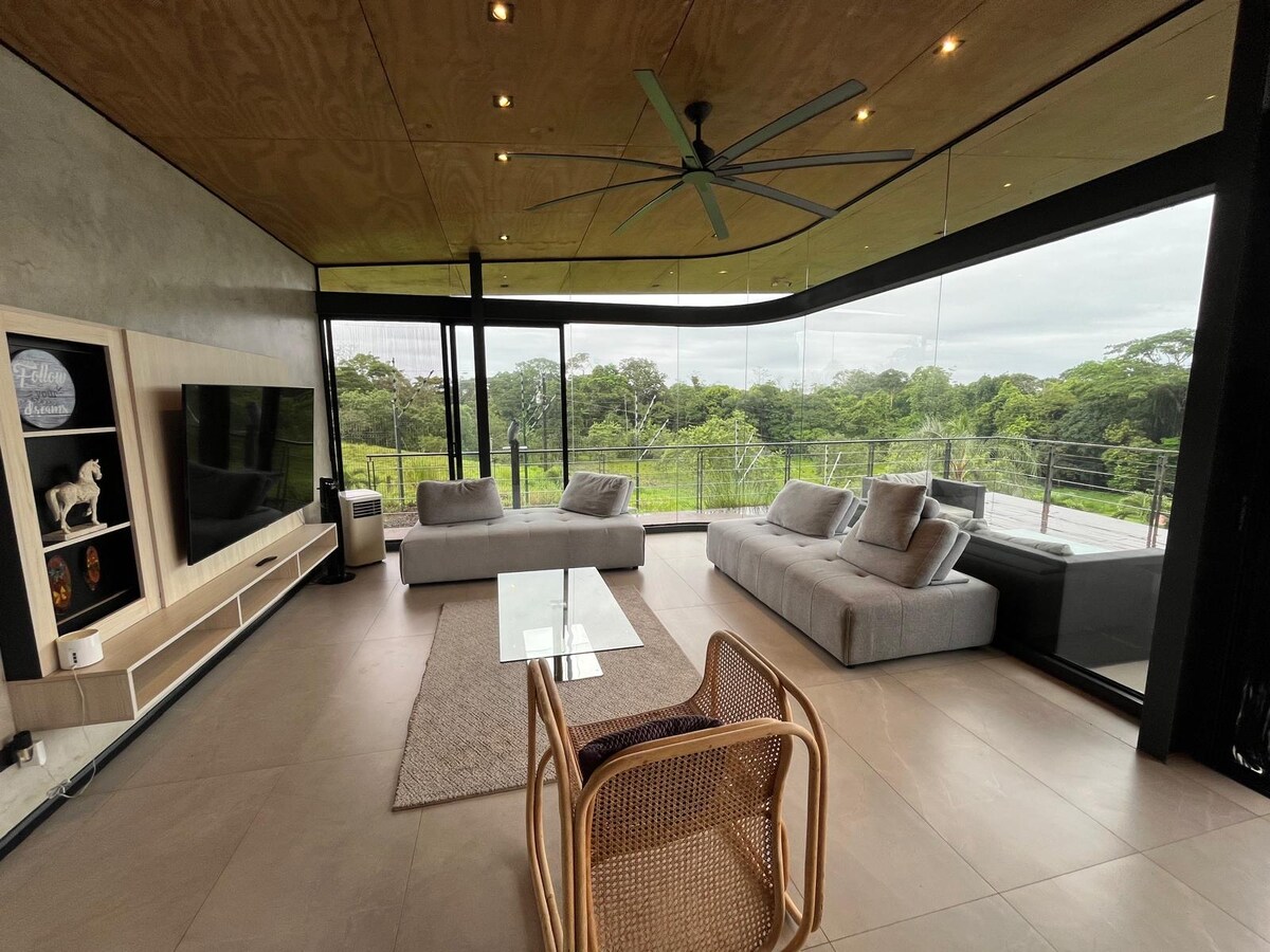 Retreat to the rainforest in a cosy, secure and modern luxury cabin, built to help you connect with nature and yourself. Enjoy your stay with a fully equipped kitchen, an amazing bathroom with a custom shower/hot tub and a one of a kind bedroom design. Explore the private trails of the property with 10 acres of primary rainforest with toucans, lapas, humming birds, butterflies and other fauna. Beware, you might not wanna leave! Located in Venecia de San Carlos, 65km from SJO airport.