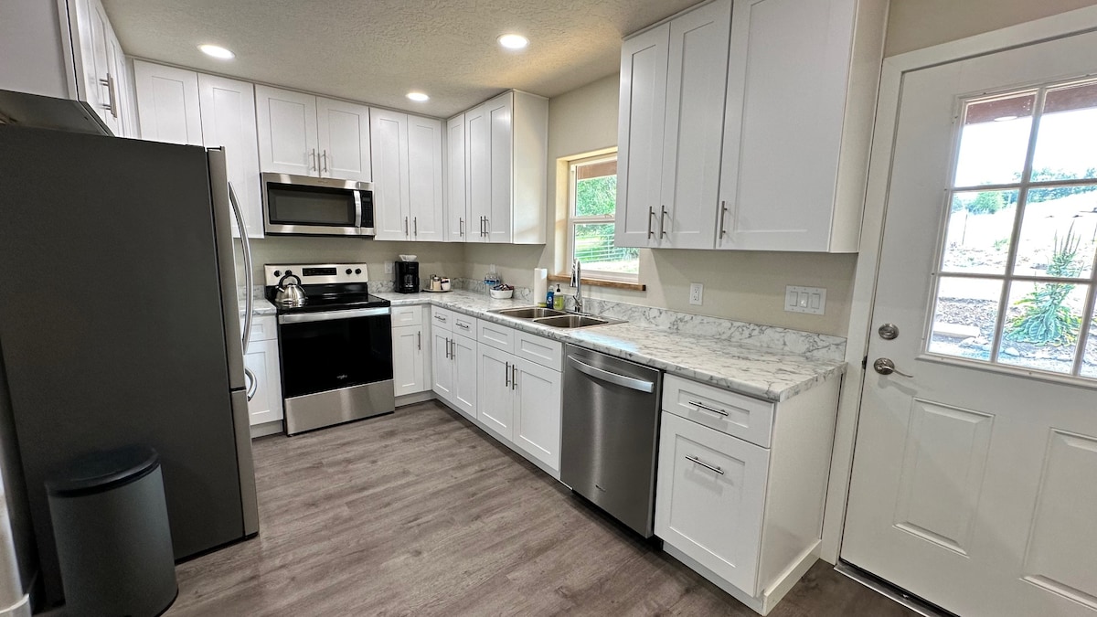 Vergiss deine Sorgen – in dieser geräumigen und ruhigen Unterkunft. Im Bauernhaus wirst du dich wie zuhause fühlen. Verfügt über schnelles WLAN für alle, die sich verbinden möchten. Es gibt eine ältere Felsenterrasse, um die Abende mit Grillen und vielleicht einem Wettbewerb im Mini-Cornhole zu genießen. Der süße Rückzugsort bietet die Privatsphäre, die du dir wünschst, und die Fülle an Freizeitaktivitäten in der Umgebung, die deinen Aufenthalt unvergesslich machen werden. Mit 3 Queensize-Betten ist Platz für 6 Personen.