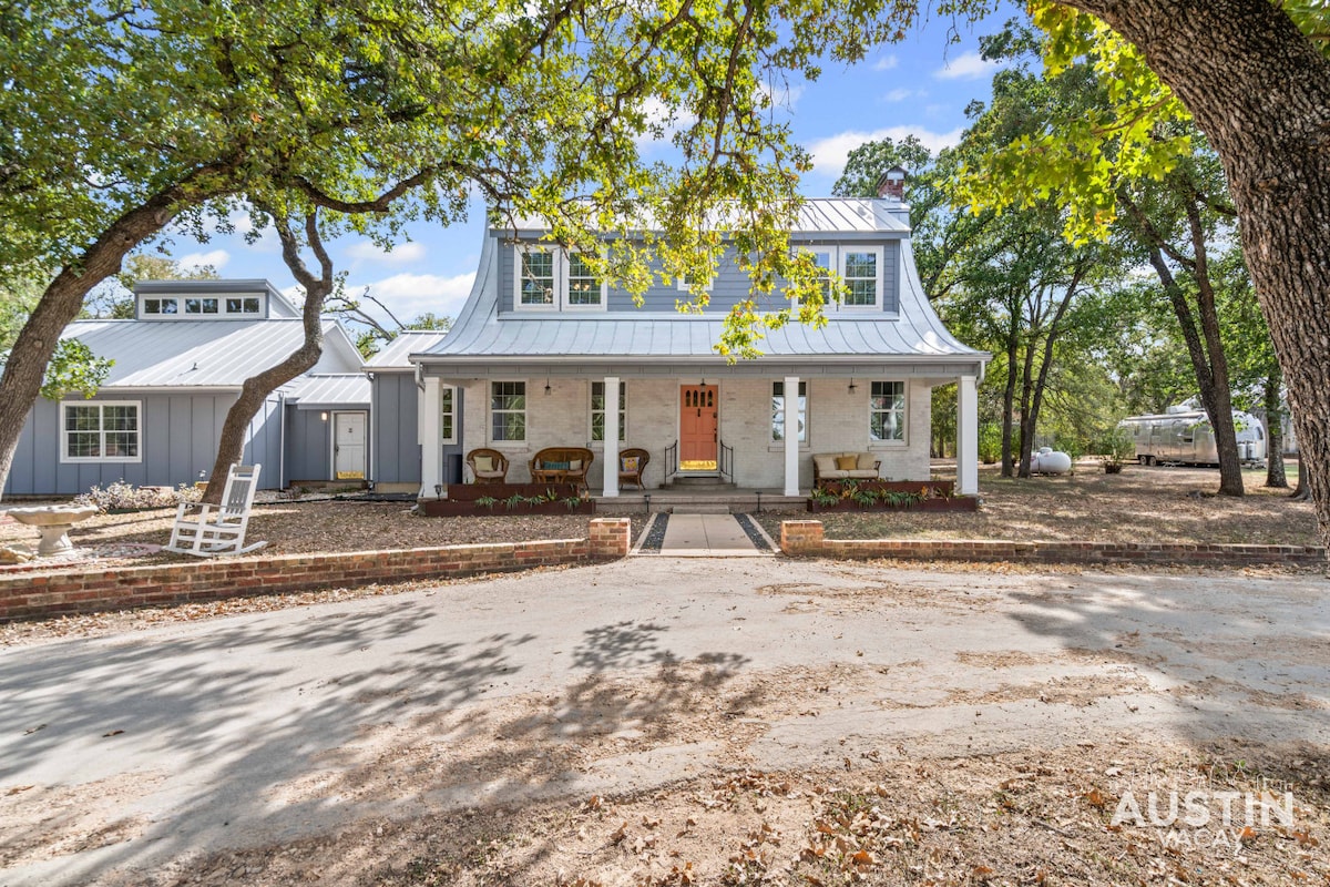 Ein perfekter Kurzurlaub für Paare und Geschäftsleute, die zum Spaß oder zur Arbeit nach Central Texas kommen. Wir haben dieses Gästestudio als ruhigen Rückzugsort vom Haupthaus gebaut, ein freistehendes Gebäude, das von der Straße zurückgesetzt ist, mit separatem Gehweg und zwei eigenen Parkplätzen. Dieser 864 Quadratfuß große Raum mit 512 Quadratfuß überdachter Veranda grenzt an einen 10 Hektar großen Grüngürtel. Das mit Metall verkleidete Äußere täuscht über das moderne Interieur des Bauernhauses hinweg. Wir befinden uns in günstiger Lage zwischen dem Texas Hill Country und Austin, Texas.