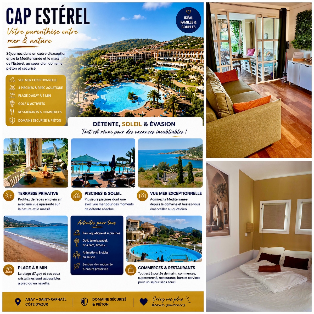 Envie de vacances au soleil sur les hauteurs de Saint-Raphaël, nous vous proposons ce bel appartement climatisé, au calme, avec vue mer et golf au cœur de Cap Esterel. Pouvant accueillir jusqu’à 4 voyageurs, il est situé dans le village de vacances Cap Esterel entièrement piétonnier et sécurisé. Accès direct possible en bus 21 à partir de la gare de ST RAPHAEL. Nous vous accueillons avec simplicité , confort et partage . Réservez dès maintenant votre parenthèse enchantée entre mer et soleil.