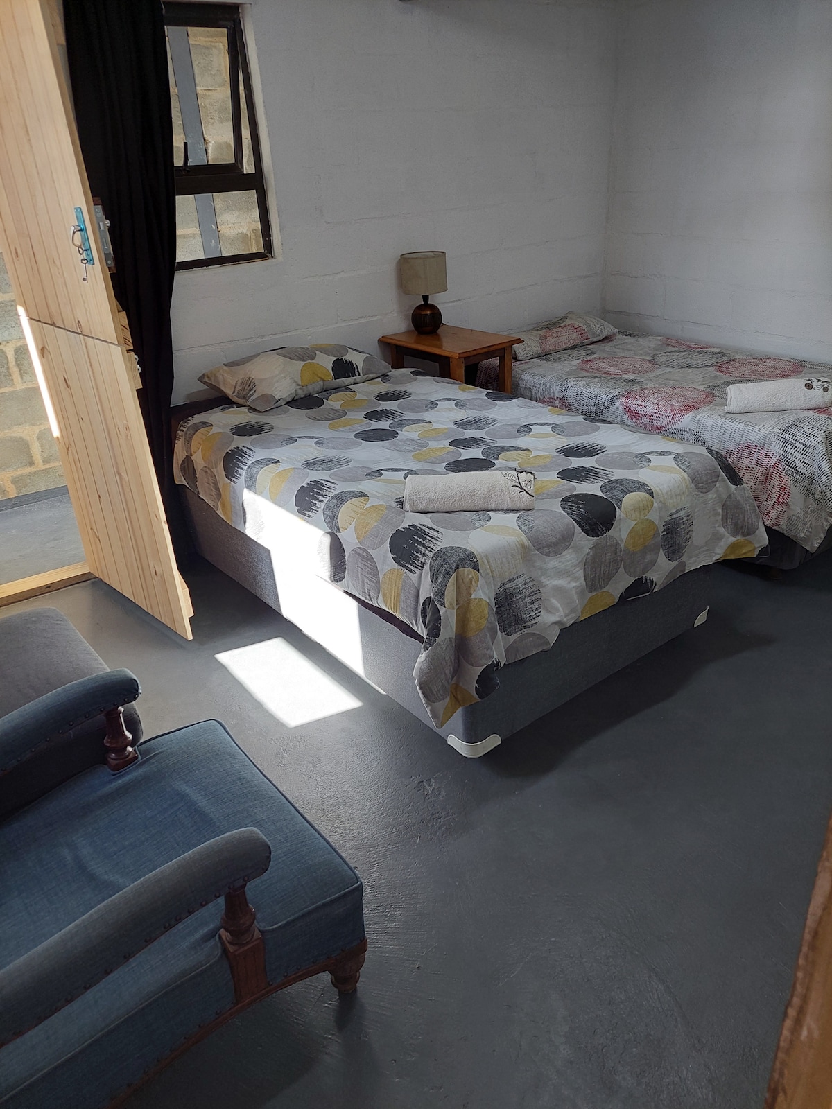 Dieses kleine Ferienhaus besteht aus einem vorderen Zimmer mit einem Doppelbett, einem Nachttisch, der auch als Büroraum genutzt werden kann, zwei Ohrensesseln zum Entspannen und einem runden Tisch für 4 Personen. Die Küchenzeile bietet die Grundbedürfnisse für die Verpflegung. Vom offenen Vorderzimmer aus betrittst du das zweite Schlafzimmer mit zwei Einzelbetten. Betrete das geräumige Badezimmer von diesem Zimmer aus. Dies ist ideal für eine Familie, aber es könnte etwas Privatsphäre fehlen, wenn Fremde es teilen. (In diesem Fall empfehlen wir, die Unterkunft für sechs Personen zu buchen, die auch bei Die Derde Bedryf erhältlich ist.)