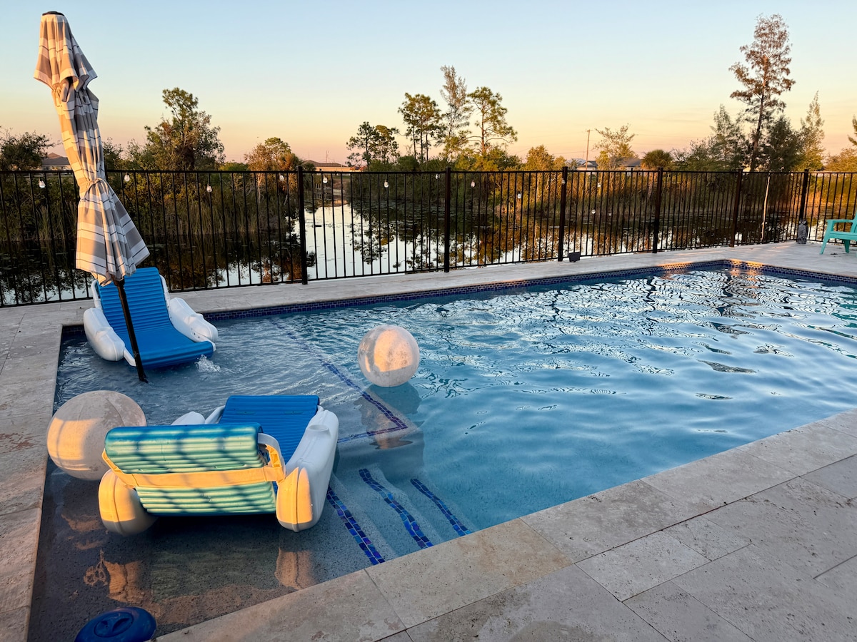 One-level, no-stairs Cape Coral home built with you in mind. Private heated saltwater pool with fountains + sun bench, fenced backyard, loungers Playset, and smart TVs in every bedroom. Sleeps 10 with 4 bedrooms & 2 full baths - has crib, pool toys, games, grill, and outdoor dining -easy self check-in, lounge chairs, umbrellas, gas grill. You will be close to lots of different cuisines within 5-10mins drive, 30 mins to the Gulf Shores beaches, 30 mins to the airport. Relax. Refresh. Rewind.