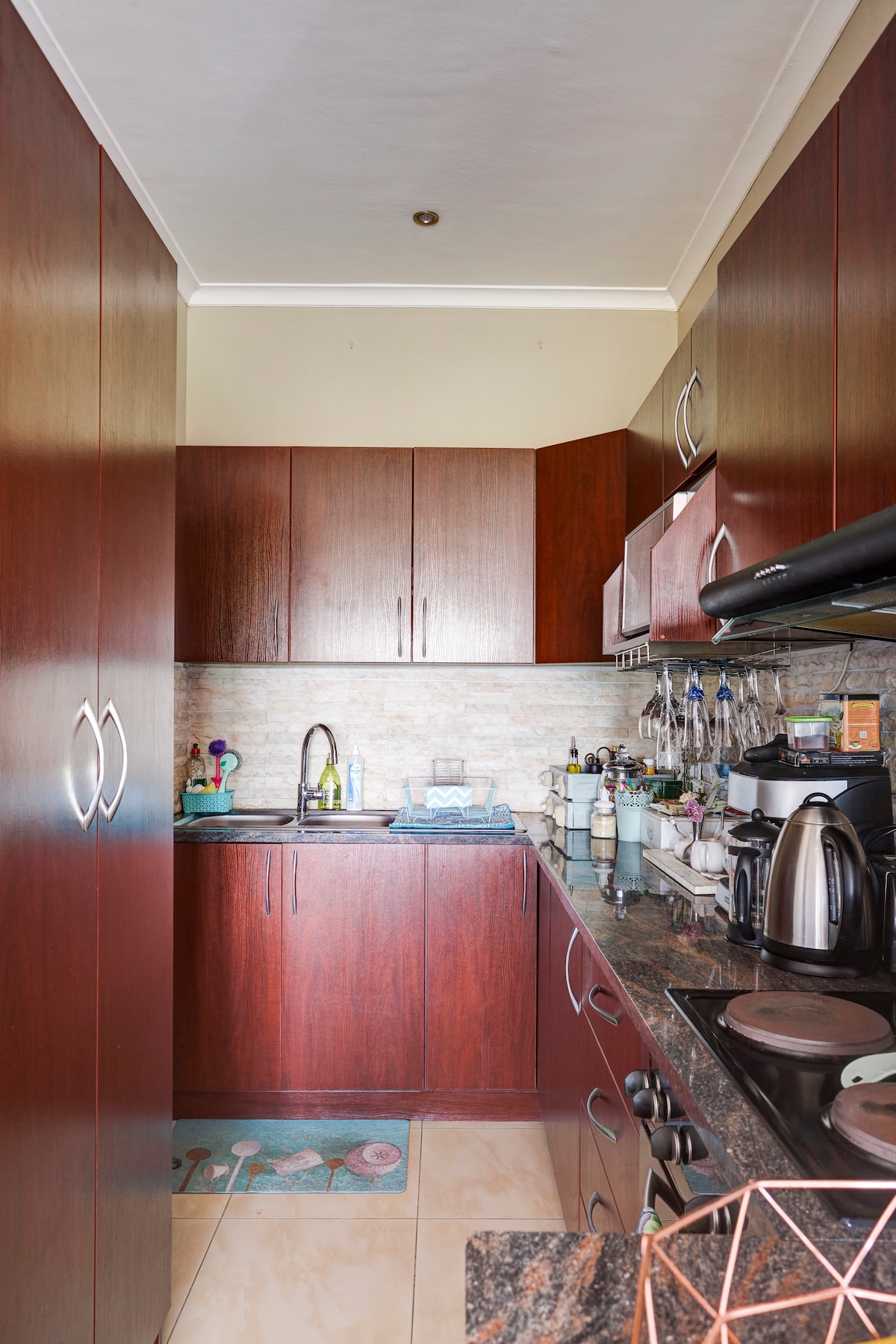 The Aloe Suite is nestled in the leafy neighbourhood of Courtrai in Southern Paarl. The double story space includes a kitchen, lounge and dining area on the lower level.Upstairs you’ll find a bedroom, en suite bathroom and a balcony overlooking the pool. Guests have a private entrance,patio and barbeque area and shared use of the pool . There is parking on the premises, TV (with netflix ) and Wi-Fi. Laundry can be arranged at a fee. Bed for a minor /child can be arranged on request too