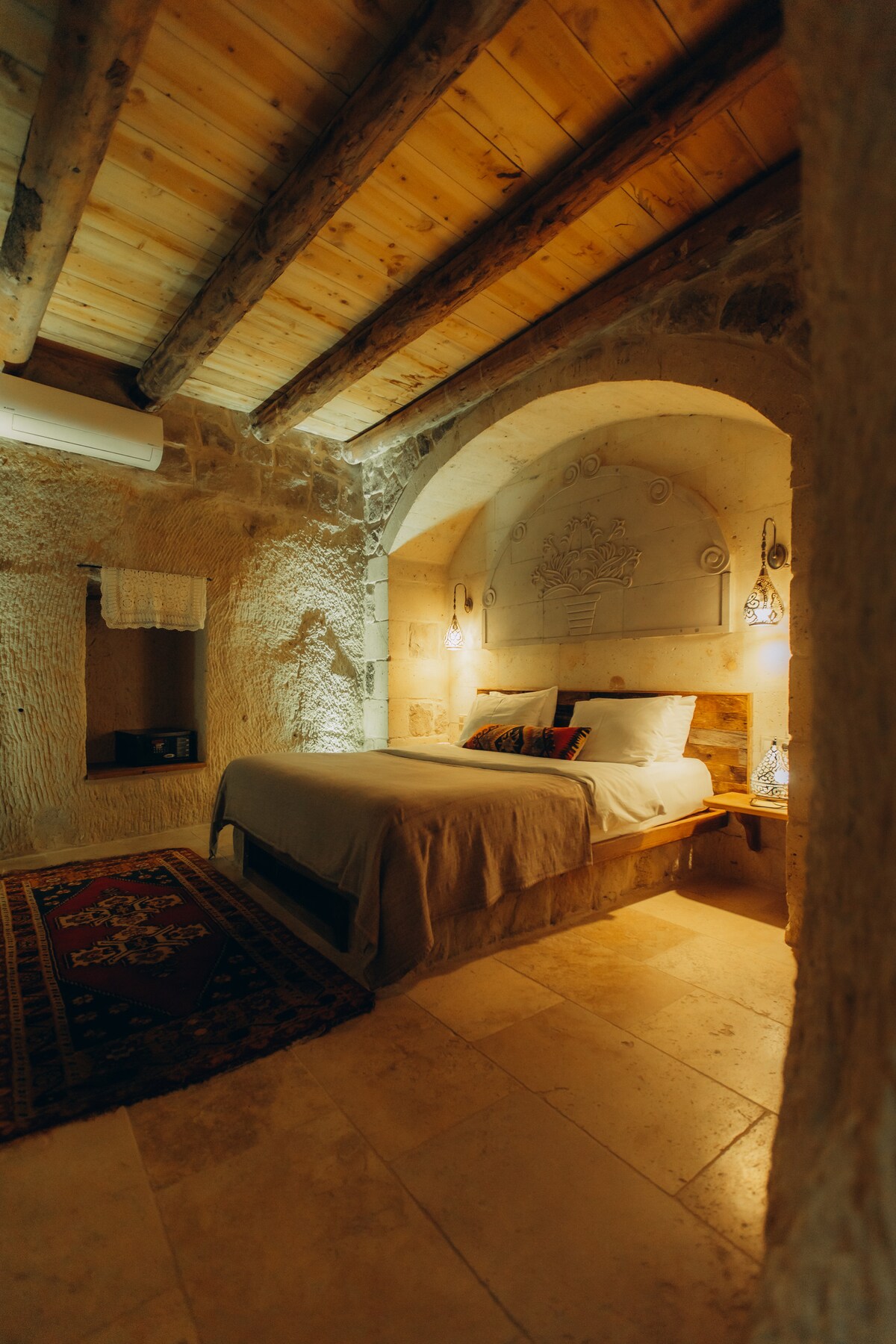 A unique accommodation experience among historical and natural stone/cave structures in the Ürgüp district of Cappadocia. For a small additional amount you can enjoy our mixed Turkish breakfast at our terrace. If you wish, you can sit at the terrace area in the evening and watch the magnificent view of Ürgüp and find peace. In the listing there are 7 room in the same room category. Your room placing will be according to availability.