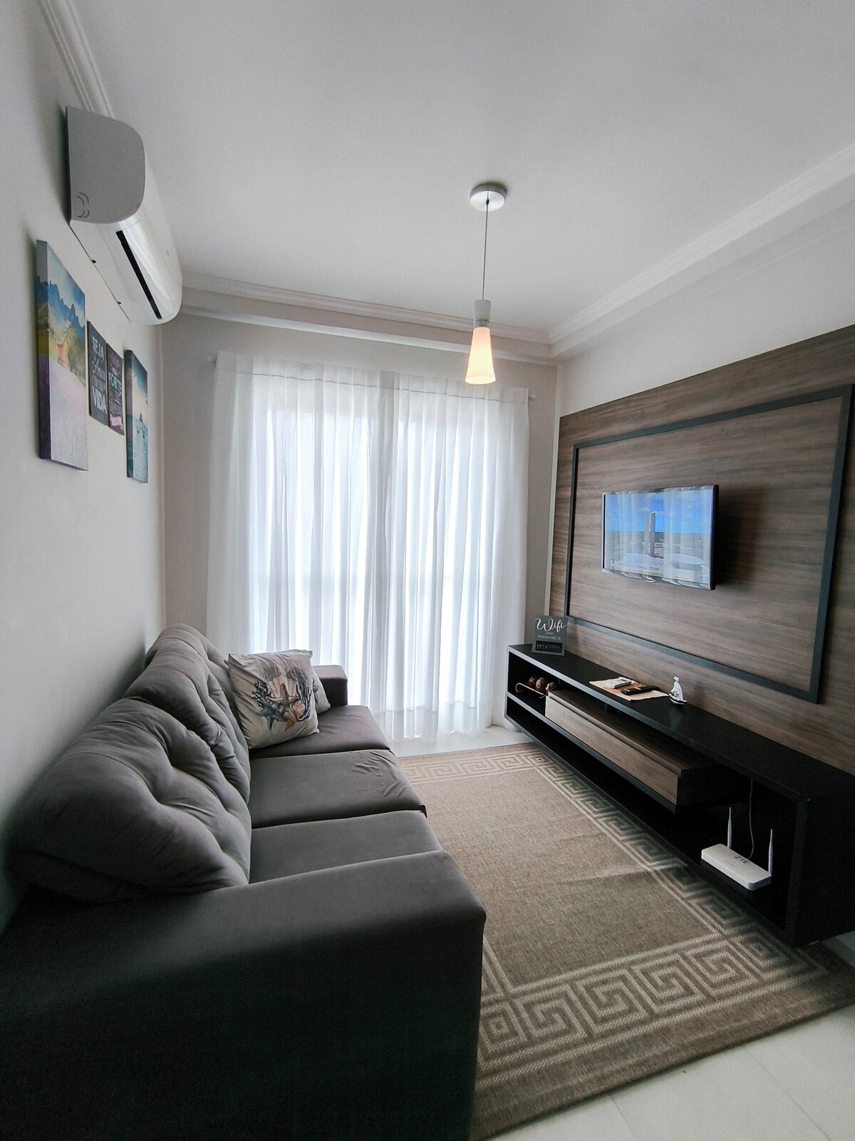 Apartamento com linda vista do mar. Rede de proteção em todas as janelas. Wifi própria. Ar condicionado em todos os ambientes. 2 quartos que acomodam até 4 adultos (18+) e 2 crianças com colchão. TV Smart 42 na sala. TV Smart 32 na suíte. Totalmente mobiliado com eletrodomésticos, utensílios de cozinha. Roupas de cama e banho. 1 vaga de garagem coberta próximo a porta. Localizado em belo condomínio, com piscina, academia, playground, sala de jogos, quadras de areia e grama, segurança 24hrs.